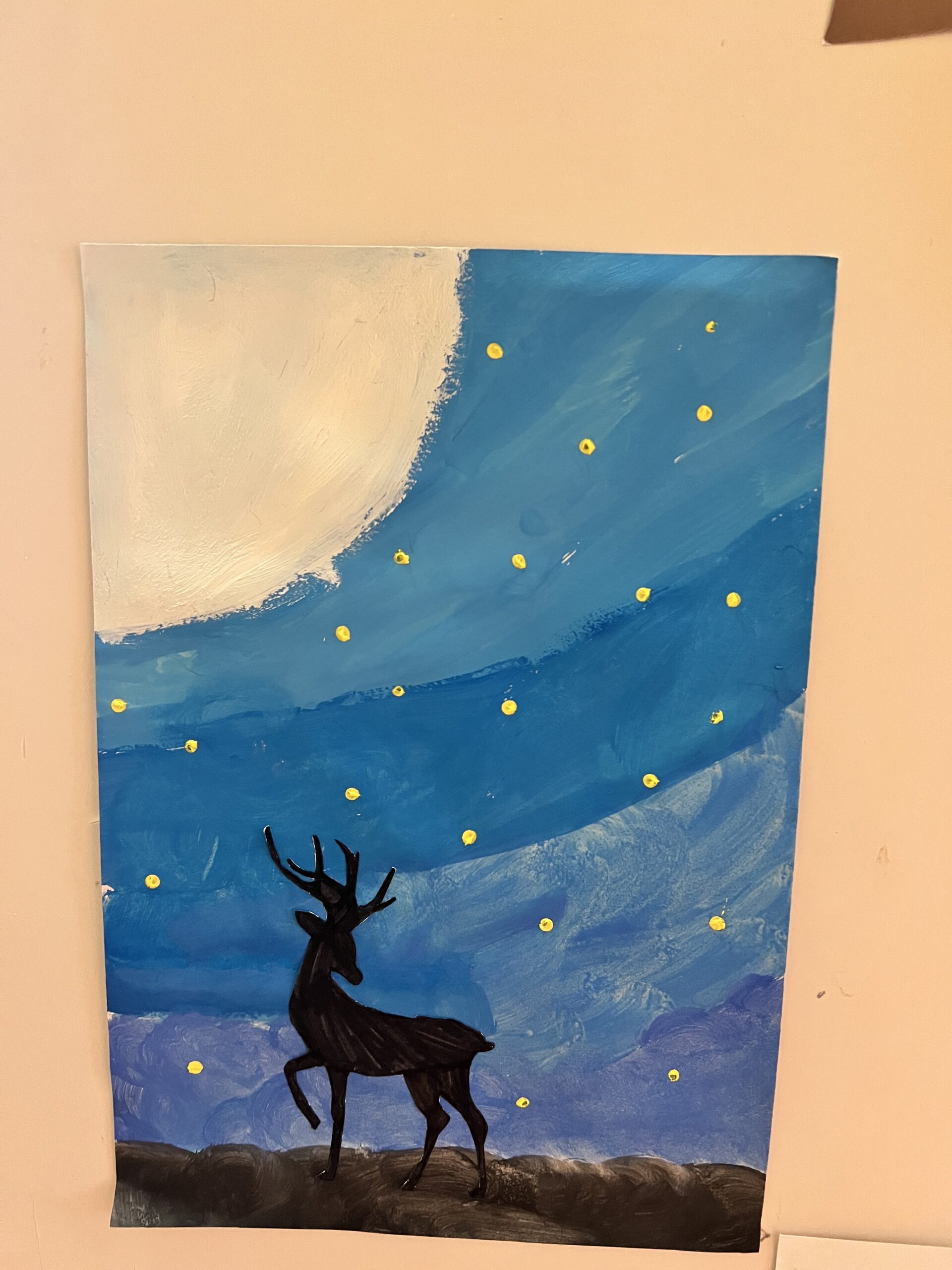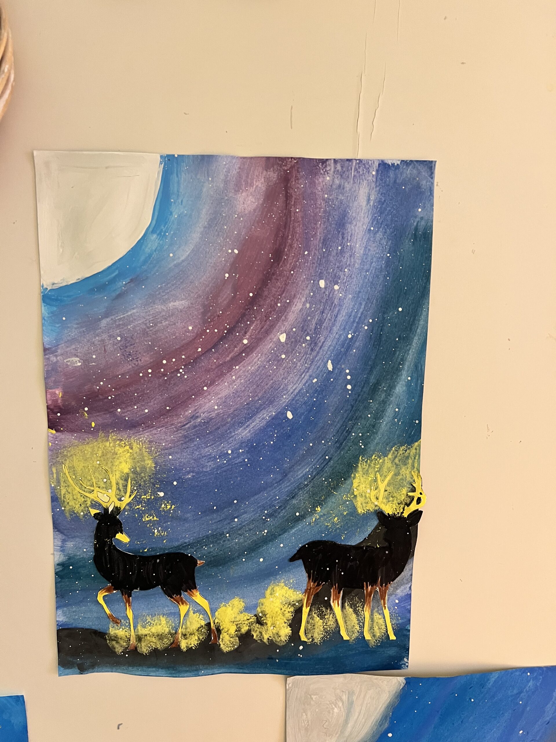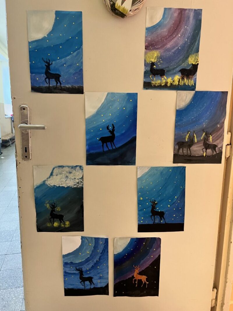 A foglalkozás kreatív részében a tanulók csodaszarvast festettek szivaccsal. Ez az aprólékos, koncentrációt és türelmet igénylő tevékenység kiválóan illeszkedett a témához, hiszen a gyerekek elmélyülten, nyugodt légkörben dolgoztak. A festés során megfigyelhető volt, hogy a tanulók figyelme fókuszáltabbá vált, miközben örömmel és lelkesedéssel alkottak.