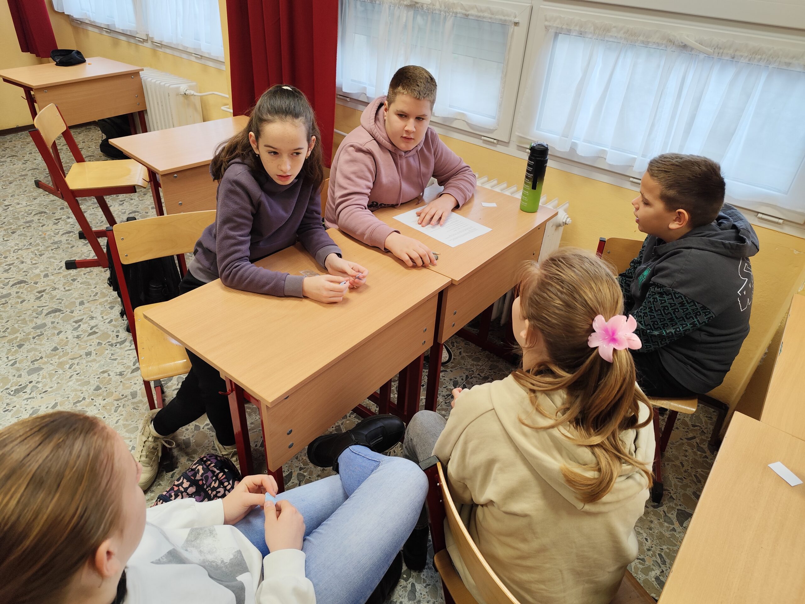 Az osztállyal a társas kapcsolatok fontosságáról beszéltünk. Mindenkinek megvan a saját feladata egy csoportmunka feladatban. 3 csoportot alkottak a gyerekek, majd küldönböző kérdésekre kellett válaszolniuk. Minden helyesen megválaszolt kérdés után a táblára felrajzolt pályán léphettek előre. Mielőtt elkezdtük a játékot, különböző szerepeket, feladatokat kaptak a tanulók, amiket a csoportmunka végéig kell alkalmazniuk, végrehajtaniuk. Volt aki olyan szerepet kapott, amivel előrevitte a csapat munkáját, de olyan is volt, akinek a hátráltatás volt a feladata. Ezután megbeszéltük, hogy csak akkor működik a csoportmunka, ha mindenki aktívan kiveszi belőle a részét.