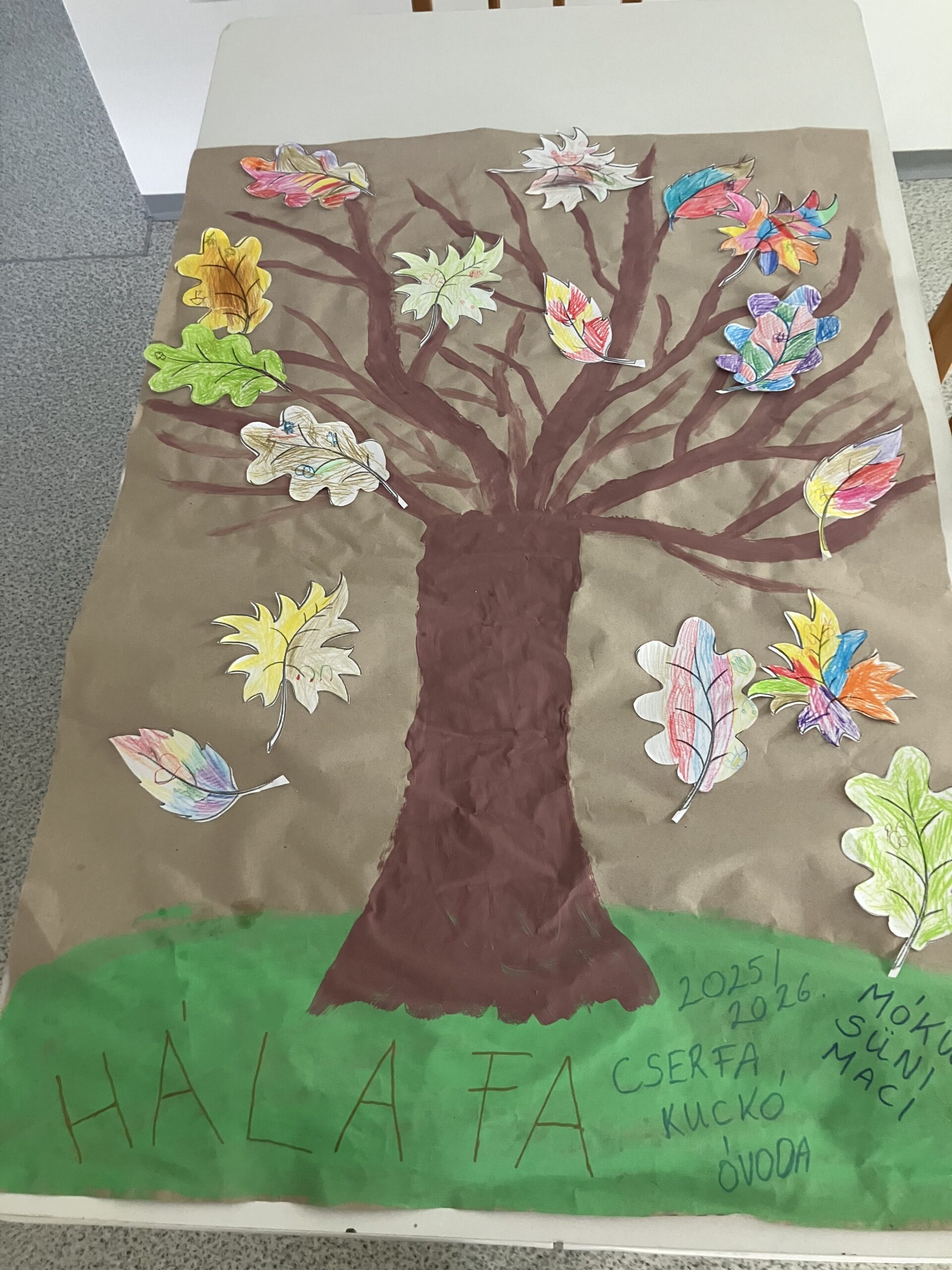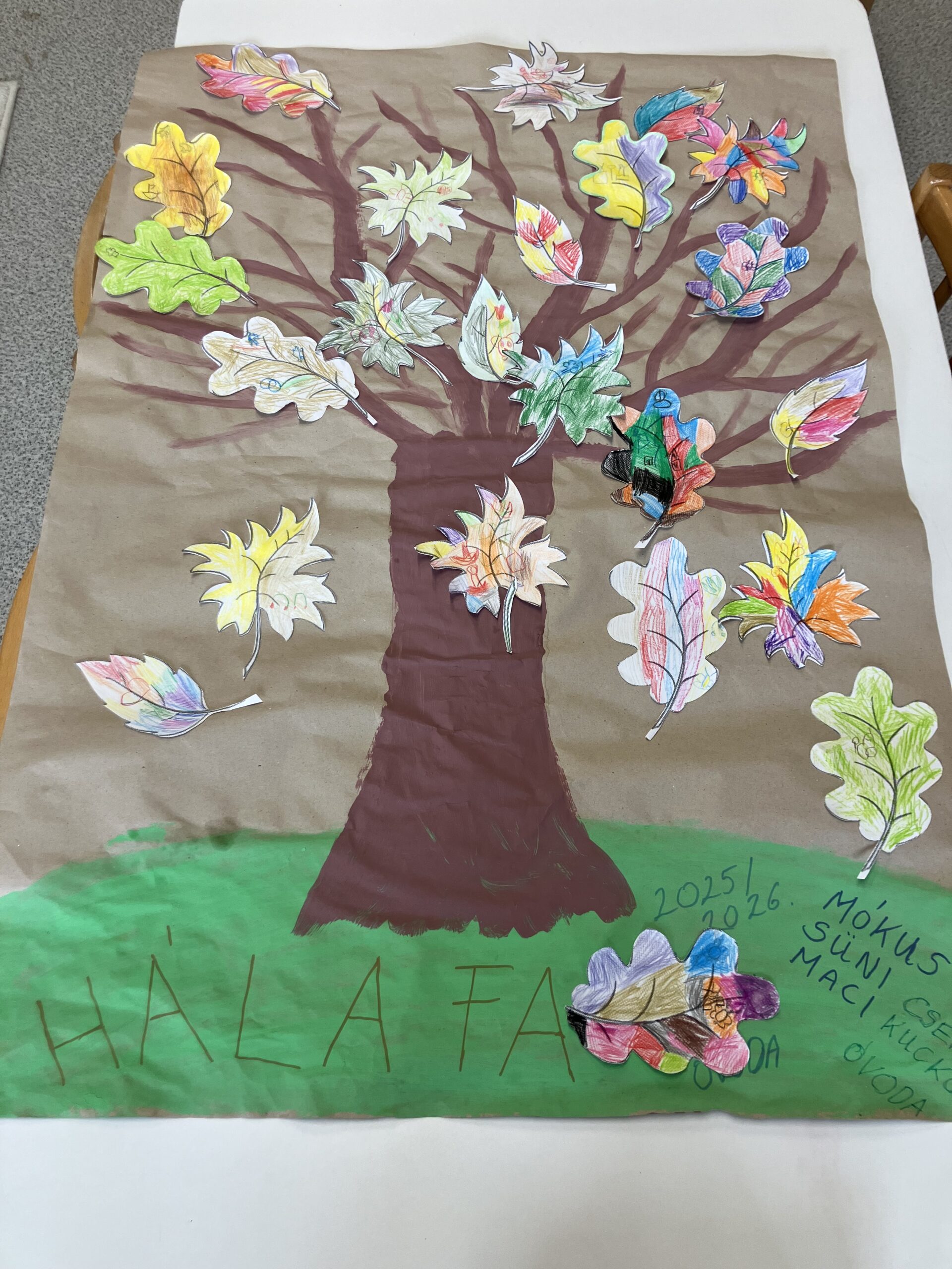 A végén a csomagoló papírra festett „Hálafa” ágaira ragasztották fel a saját leveleiket, így a Hálafa egy színes, őszi hangulatot keltett, vidám fa lett.