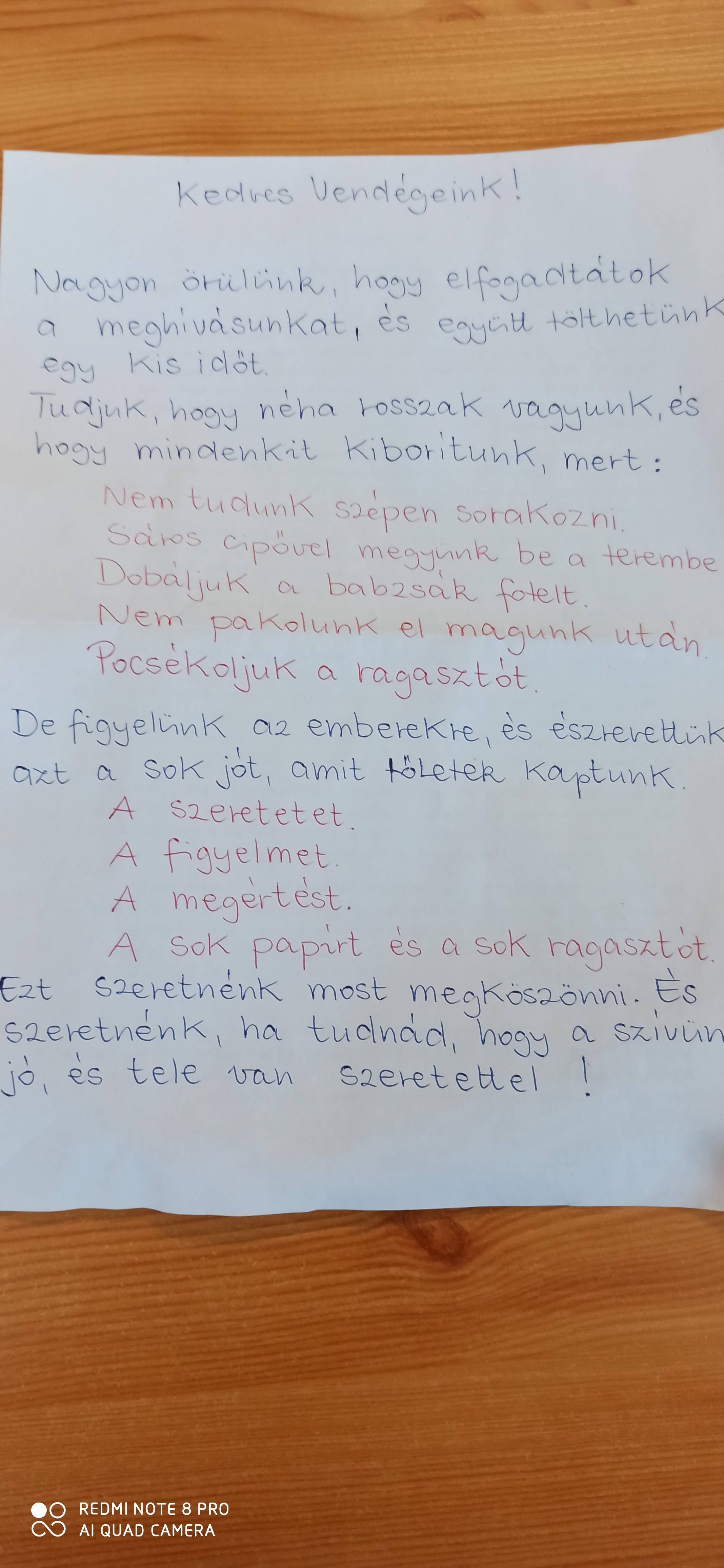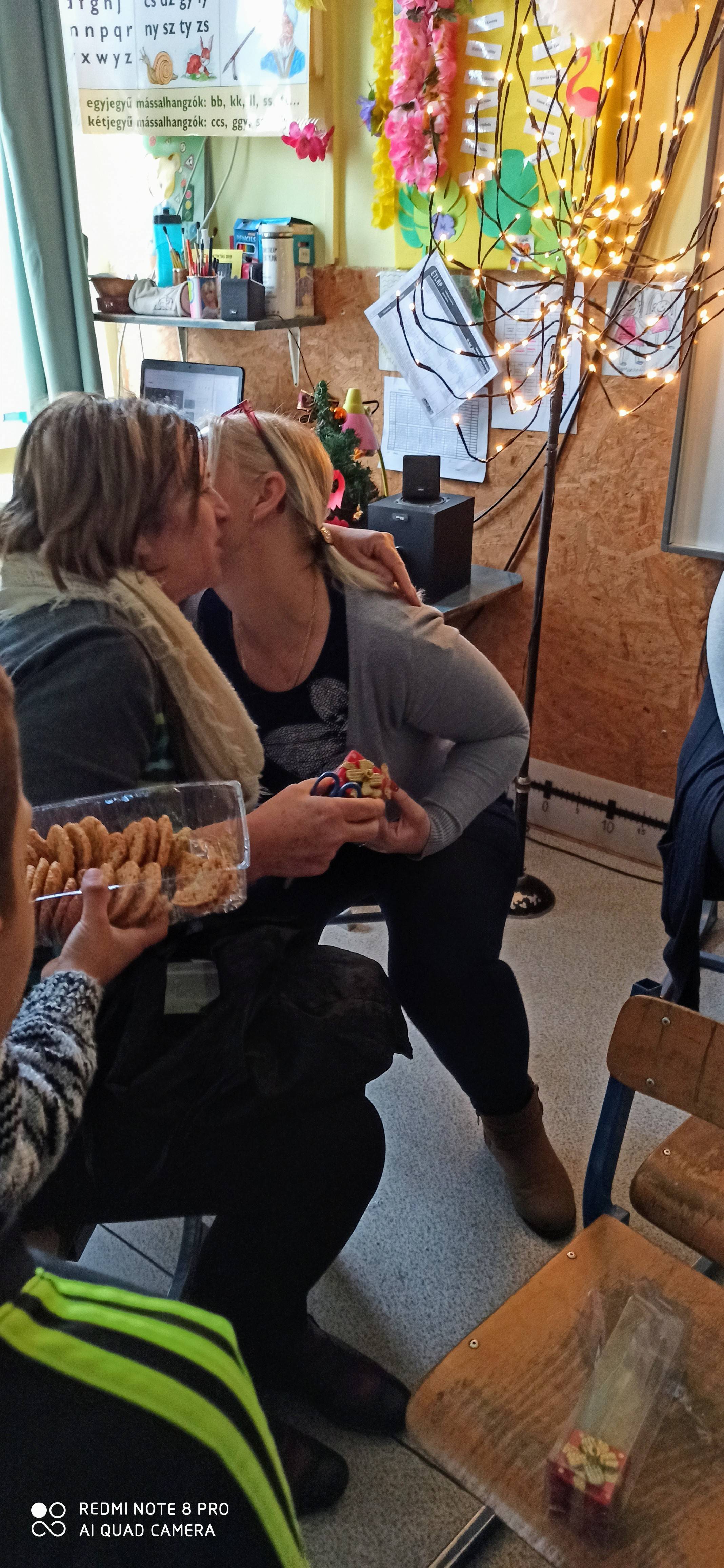 Jótetteink2- Osztályom tanulói nehéz körülmények között élő, halmozottan hátrányos helyzetű gyerekek. Tudja ezt mindenki az iskolában, ezért ahol tudnak segítenek: egy kis cipő, egy törülköző, karácsonyi képeslapok. A takarítók párnát varrnak, a konyhai dolgozók összegyűjtik a maradék gyümölcsöt, a szociális segítő beszerzi az úszásoktatáshoz szükséges dolgokat. Az egész évben nyújtott kiemelt figyelem meghatott minket, ezért az iskola dolgozóinak egy kis műsorral köszöntük meg a fáradozásukat. Együtt ült az iskolaigazgató, az iskolatitkár, a gyógypedagógus, a konyhai dolgozó és a takarító. A szövegek, a dalok a hála hangján szólaltak meg.