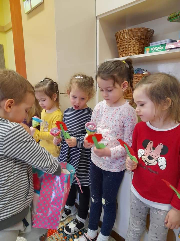 Mosolygó képeket nézegettünk laptopon, és fénykép formájában is. Elmeséltem Bezzeg Andrea: Újra együtt! című meséjét. Tornyokat építettünk, egyet Pirinkónak, egyet Góliátnak. Ehhez kapcsolódva beszélgettünk a barátságról is. Nőnapot köszöntöttek a fiúk, a lányok nagy-nagy örömére. Rengeteget mozogtunk, sok vicces feladattal kiegészítve. Játszottunk az érzékszerveinkkel! Babot csíráztattunk, melynek fejlődését folyamatosan nyomon követhették! Ez is hozzá tartozott a mindennapi apró örömeinkhez! Mi van a takaró alatt? – tapogatós játékot, milyen hangszer szól? – hallásfejlesztő játékot, illat és íz érzékelő játékokat játszottunk: Terülj, terülj asztalkám! Képeket gyűjtöttünk a megfelelő érzékszervekhez, ezeket megbeszéltük. Az Örömölelést többször játszottuk a hónapban. Ez a „játék” túlmutatott a csoporton kívül is. Egyre jobban bővítettük a kört az óvodára, gyerekekre, felnőttekre, és a családba is tovább adták. Végül felragasztottuk a Boldogság vár hetedik lépcsőfokát.
