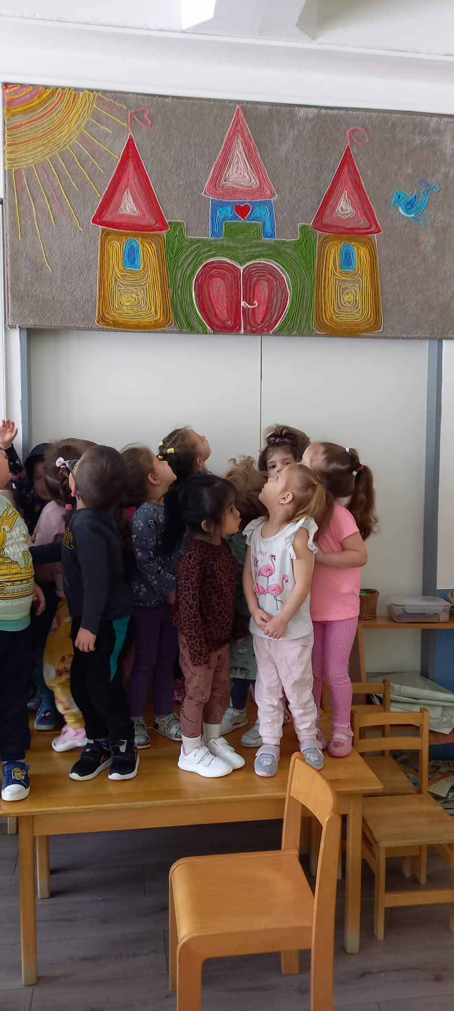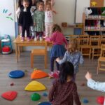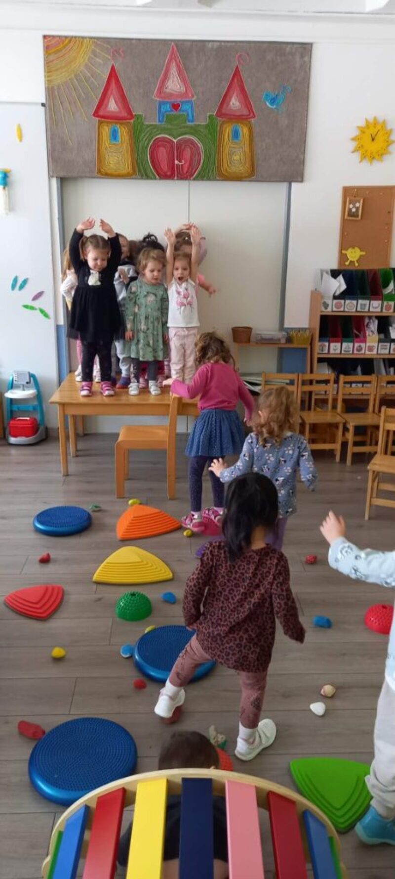 A mese mozgásos feladatai – például akadálypályák, víz elkerülése, kövekkel és mozgáseszközökkel történő gyakorlások – nemcsak a finom- és nagymotoros képességek fejlődését segítették, hanem a gyermekek testi önkontrollját, koordinációját és kitartását is fejlesztették. Az ilyen, és hasonló játékok során a gyerekek megtanulják a kihívásokkal való megküzdést, a siker és kudarc élményét, ezáltal erősödik az önbizalmuk és az önreflexió képességük. A boldog várba való eljutás folyamatában, ahol zenéltünk és táncoltunk, a mozgás és a zenei élmény egyensúlyt teremtett a testi és lelki jólét között. Bagdi Bella: Van nekem egy álmom című dalát többször hallgattuk, melyhez mozdulatokat találtunk ki. Ez a tevékenység támogatta a gyermekek érzelmi kifejezőkészségét, a közösséghez való kötődést és az empátiát.