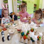 A hónap végén a húsvéti készülődés került előtérbe, amely különösen nagy izgalmat és örömet jelentett a gyermekek számára. Beszélgettünk a húsvéti hagyományokról, majd közösen tojásokat festettünk. A tojásfestés során a gyerekek szabadon alkothattak, válogathattak a színek között, és nagy lelkesedéssel díszítették saját húsvéti tojásaikat. Ez a tevékenység nemcsak az alkotás örömét adta meg számukra, hanem az ünnepre való ráhangolódást is segítette.