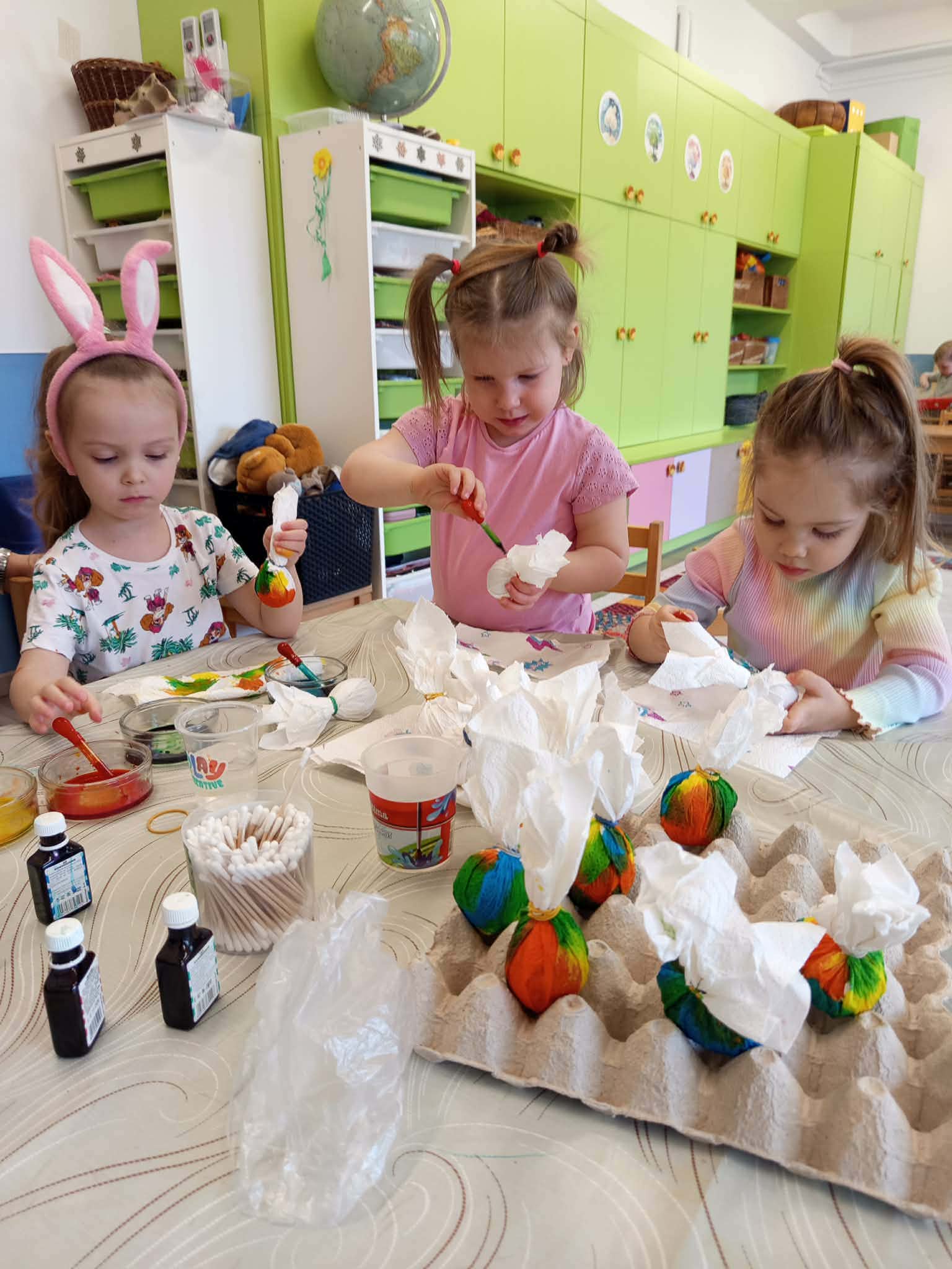 A hónap végén a húsvéti készülődés került előtérbe, amely különösen nagy izgalmat és örömet jelentett a gyermekek számára. Beszélgettünk a húsvéti hagyományokról, majd közösen tojásokat festettünk. A tojásfestés során a gyerekek szabadon alkothattak, válogathattak a színek között, és nagy lelkesedéssel díszítették saját húsvéti tojásaikat. Ez a tevékenység nemcsak az alkotás örömét adta meg számukra, hanem az ünnepre való ráhangolódást is segítette.