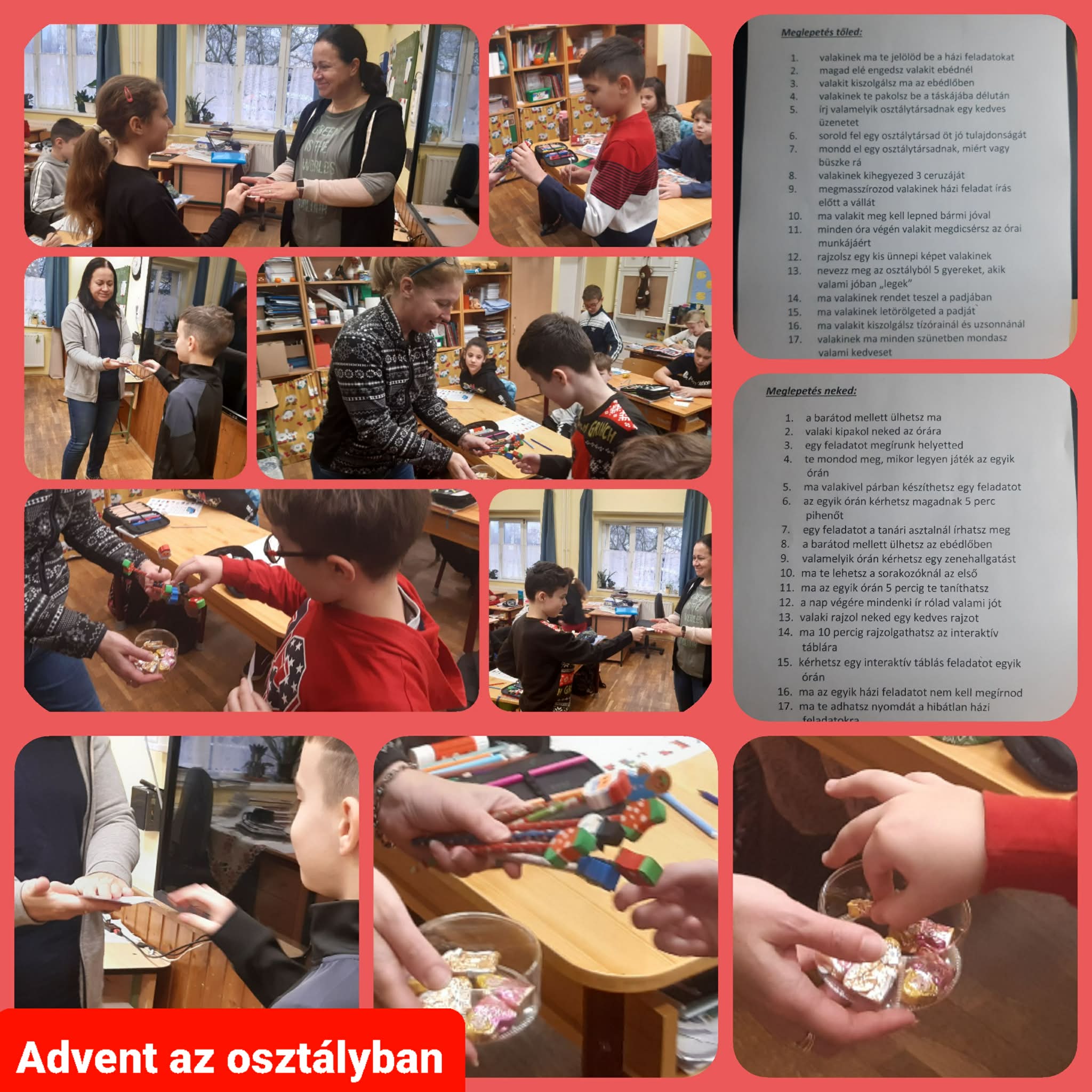 Osztályon belül a már hagyománnyá vált adventi készülődésünk során segíthettünk egymásnak. Minden nap kihúztuk egy kisgyerek nevét, aki tőlünk egy apró ajándékot (ceruza, téli mintás radír, csoki) és egy „mentességet” kapott (nem kell megírni az egyik házit, oda ül, ahova szeretne, ő lehet az első minden sorakozónál, ő adhat nyomdát a hibátlan feladatokra, vagy éppen kiszolgáljuk: ebédnél, kipakolunk helyette, megírunk helyette egy feladatot stb.). Ő pedig szintén jót tesz valakivel (megmasszíroz valakit házi feladat írása előtt, ebédnél kiszolgál valakit, rendet tesz valakinek a padjában stb.). Idén nem a szerencsére bíztuk ezeket a jócselekedeteket, hanem mindenki választhatott, hogy mit szeretne magának, és kivel milyen jót szeretne tenni. Nagyon tanulságos volt, hogy a gyerekek jobban élvezték azt, amikor ők segíthettek, jobban várták, hogy ők tehessenek jót, mint azt, hogy velük tegyenek jót. Inkább olyan feladatokat választottak, amikor másoknak segíthetnek ahelyett, hogy maguk számára kértek volna valami könnyítést. Ezt nagyon szívmelengető volt megtapasztalni!