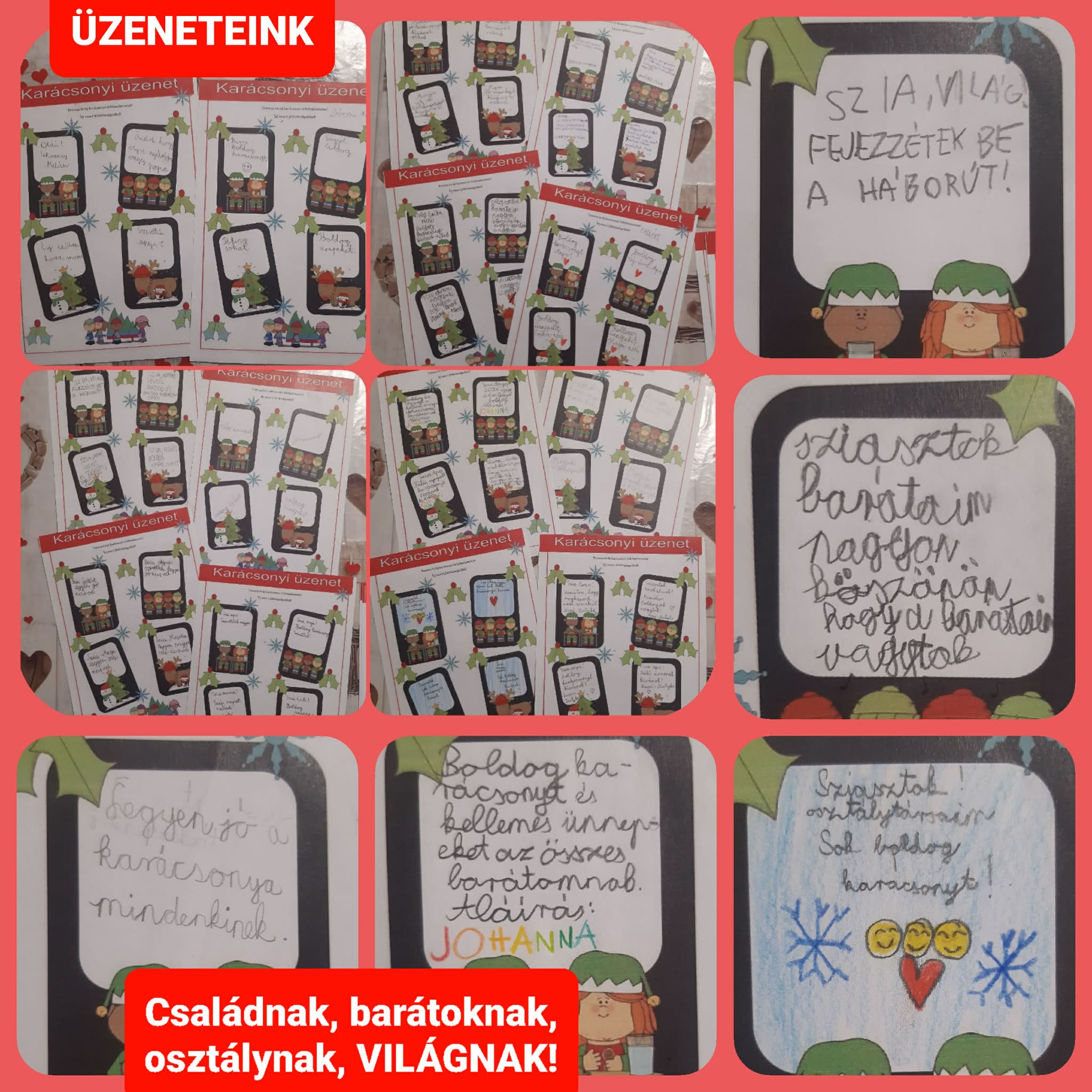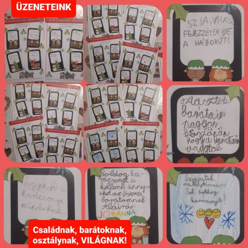 Természetesen a kreatív feladat sem maradhatott ki a Boldogságórás feladatok közül. Pozitív telefonüzeneteket írtunk családtagjainknak, barátainknak, de volt olyan kisgyerek, aki a világot szólította meg üzenetével. Sokszor halljuk ebben a hónapban, hogy mi az igazi érték, mit kívánhatnánk egymásnak az ünnepek alkalmával, mi most papírra is vetettük ezeket a jókívánságokat.