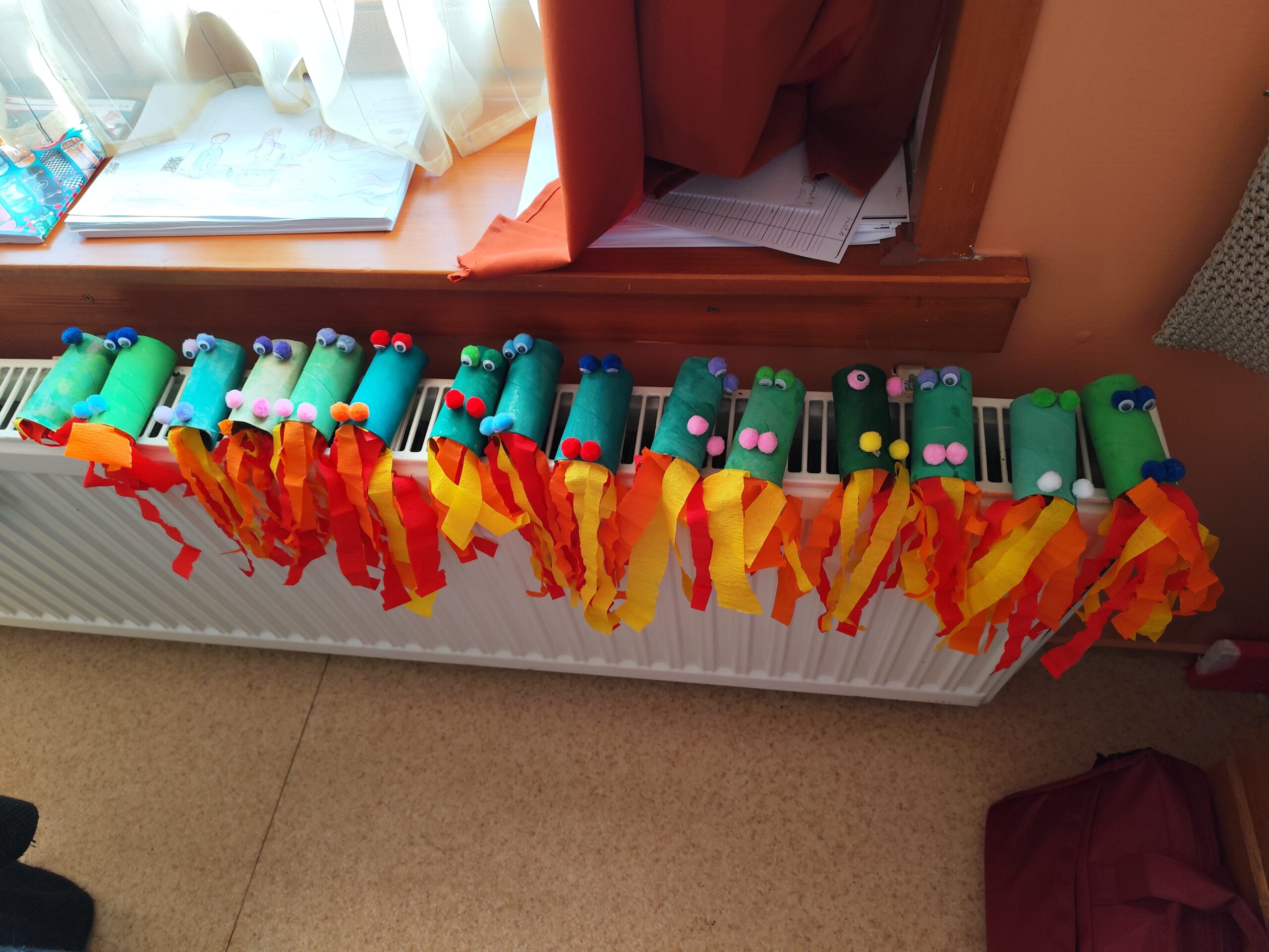A mesékben egy félelmetes sárkányt kell legyőzni, így most egy sárkányt készítettünk wc papír gurigàból. Nagyon élvezték.