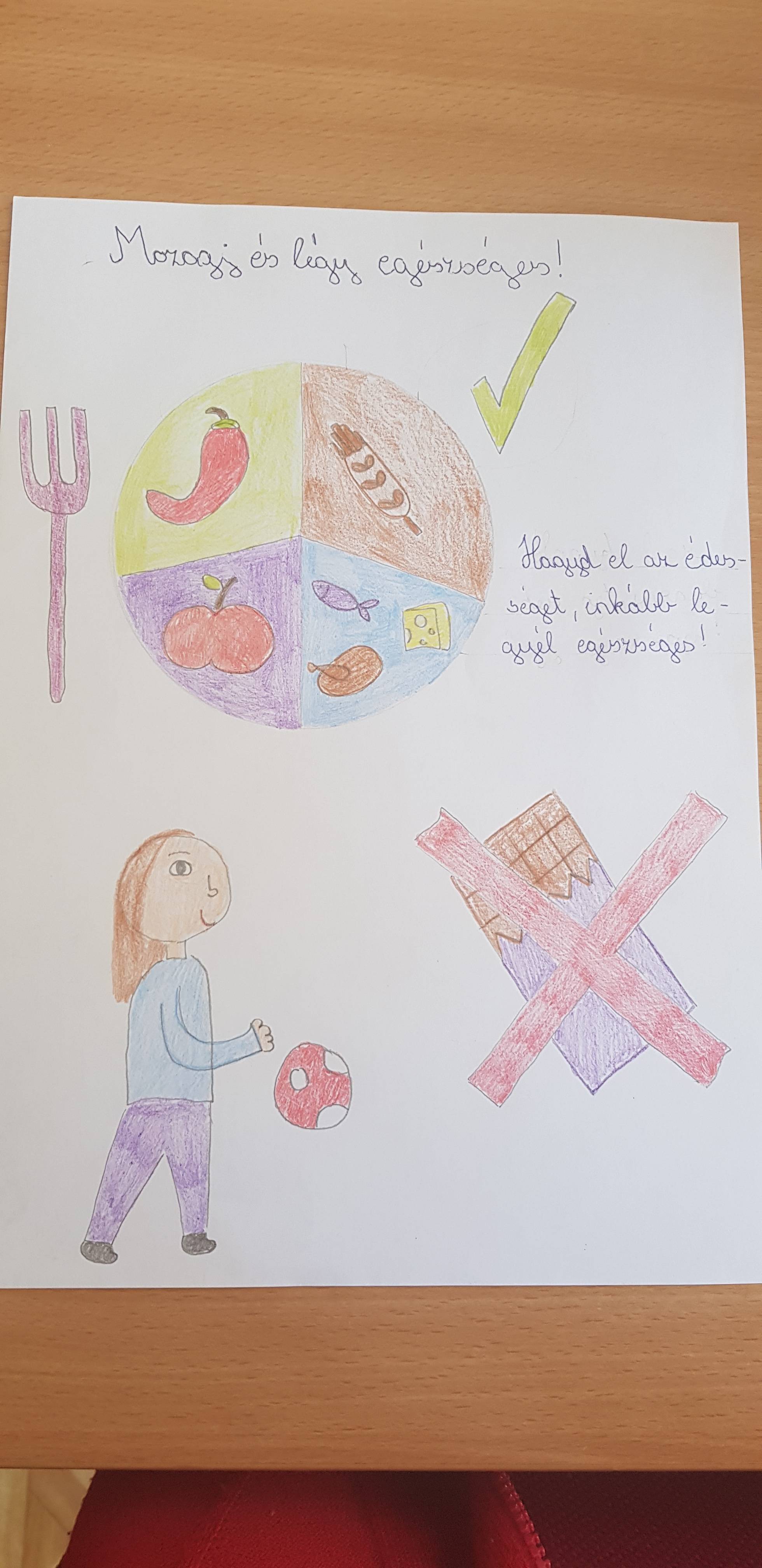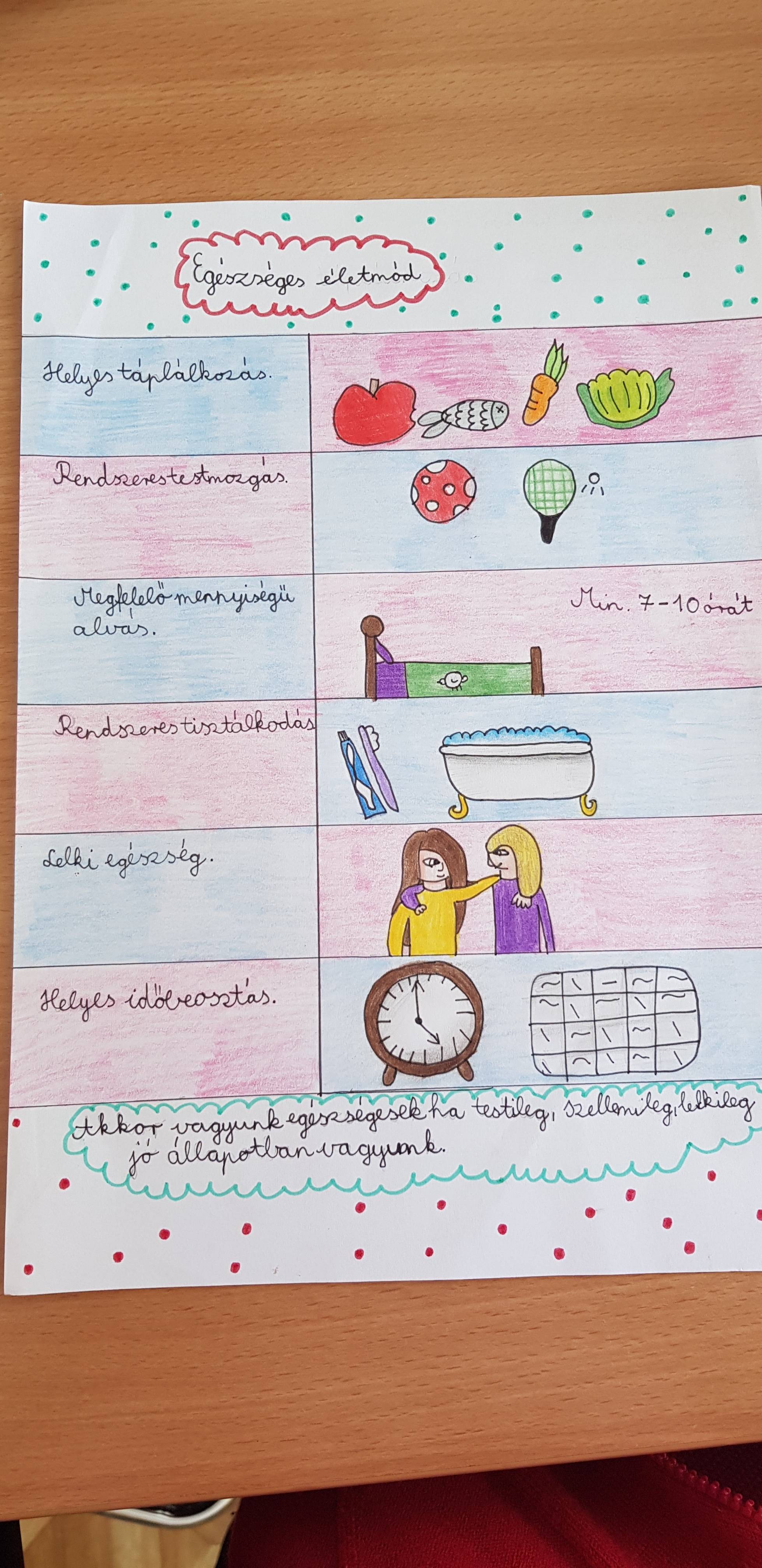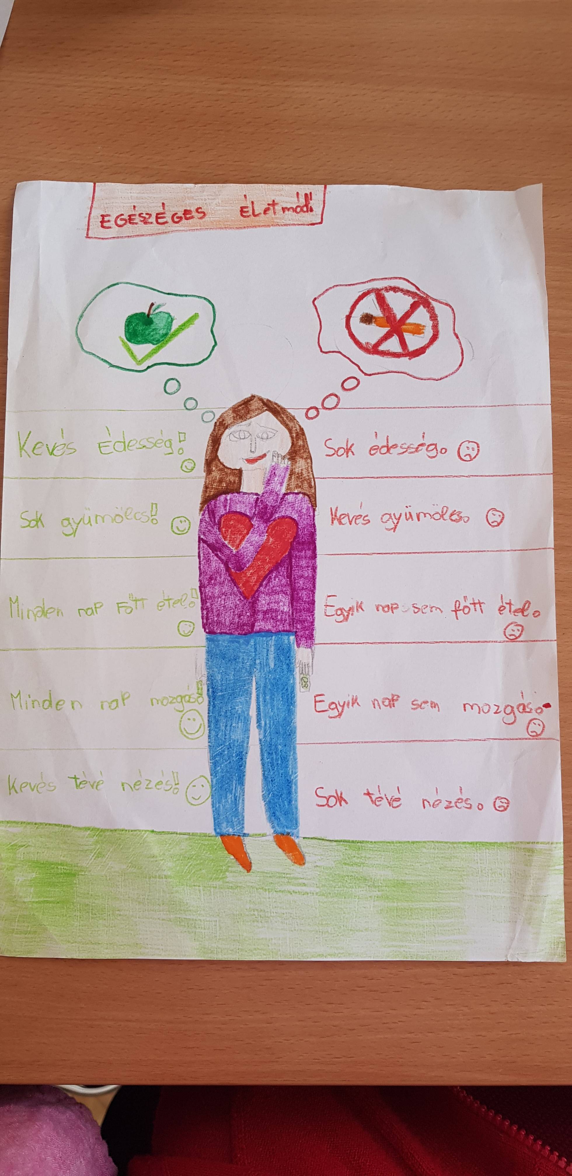 Ezt a foglalkozást már nagyon várták a tanulók, mivel nagyon szeretnek mozogni, sportolni, játszani. Miután megbeszéltük, hogy mit jelent az egészséges életmód számukra, az volt a kérés, hogy a rajzokat egyénileg elkészítik, de menjünk ki a szabadba és mindenki mozoghasson, sportoljon. Így is tettünk. Úgy gondolom, hogy ez olyan téma, melyről kevesebbet kell beszélni, és annál többet tenni érte, ezért beleegyeztem. Nagy öröm volt számomra, hogy a gyerekek végig , szinte fáradhatatlanul játszottak, sportoltak. A következő alkalomra pedig elhozták alkotásaikat.