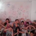 A kép egy „táblácska” foglalkozás után készült, melyen jól látszik, mennyire szuperül érezték magukat. A táblán mögöttük az alkotásaik. A boldog gyereklét fenntartását segítette ez a délelőtt.