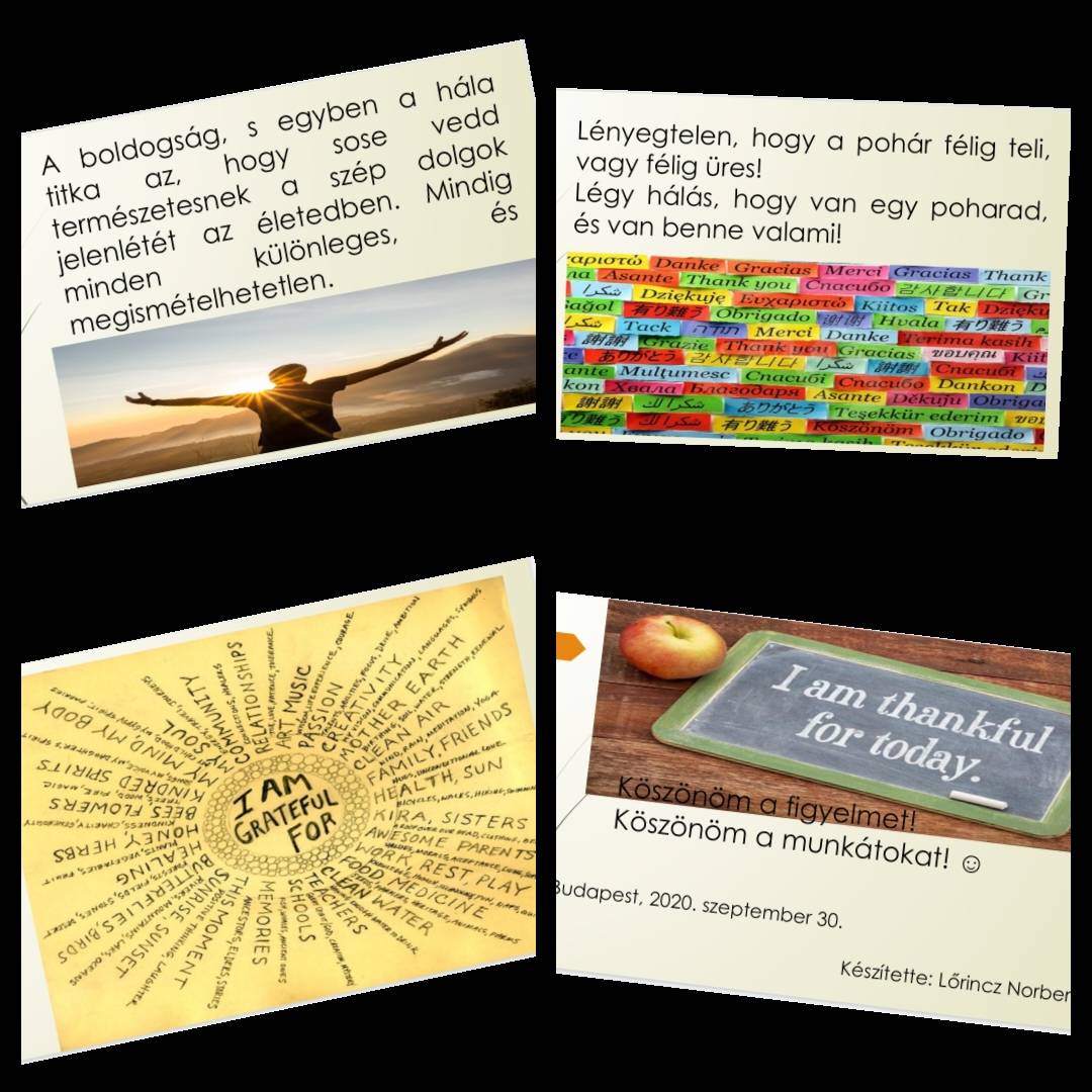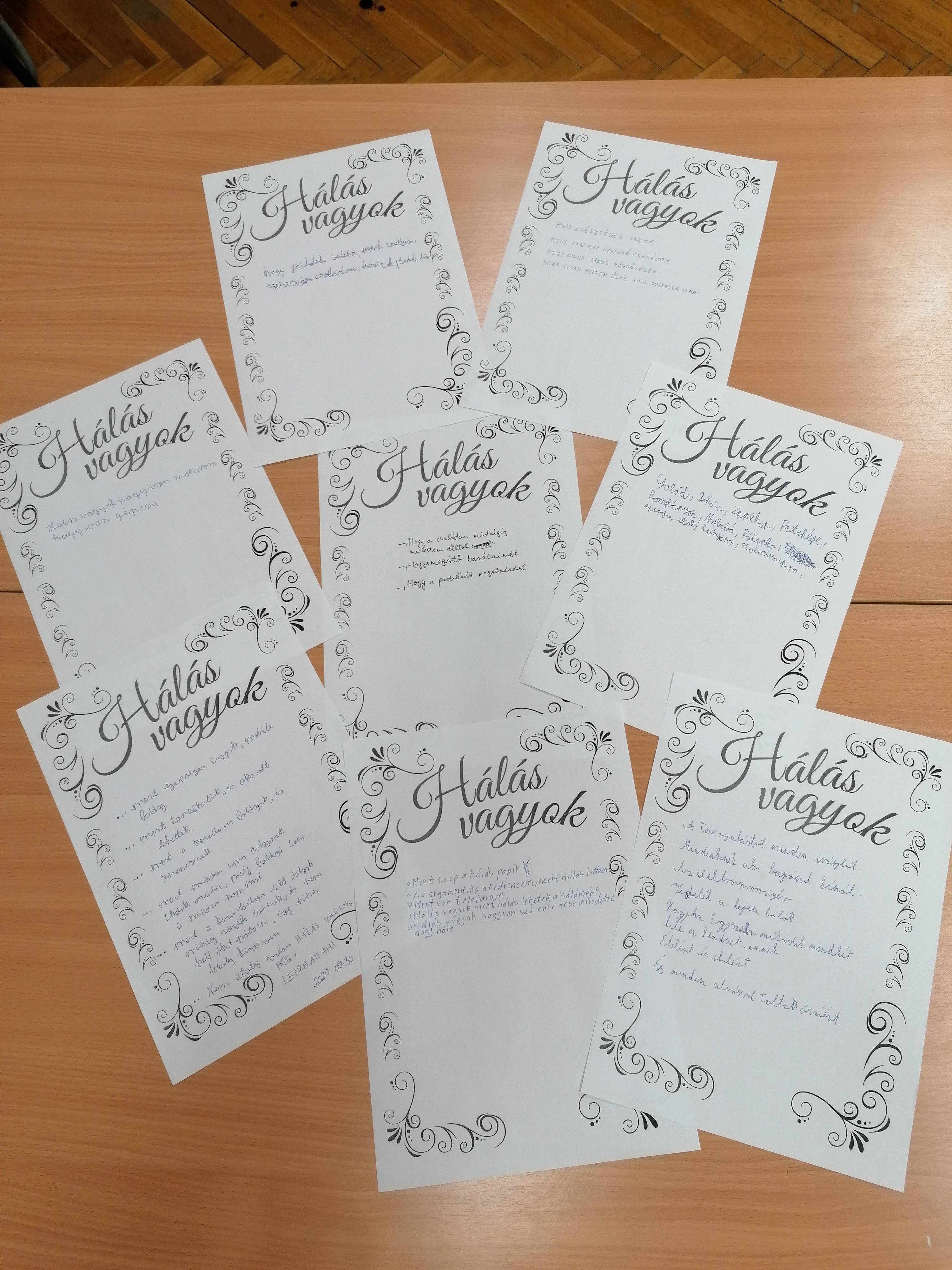 A tanulók által elkészített „Hálás vagyok…” kezdetű mondatokból egy kollázst készítettünk, melyet a tanulószobába belépve minden alkalommal megtekinthetnek. Fontos, hogy lássák, miért érdemes minden nap hálásnak lenniük.