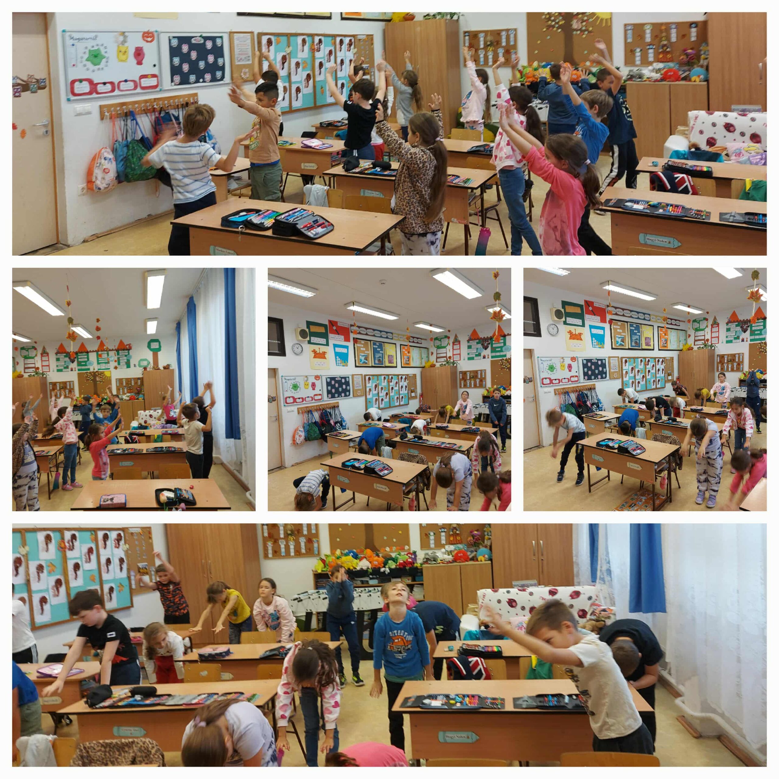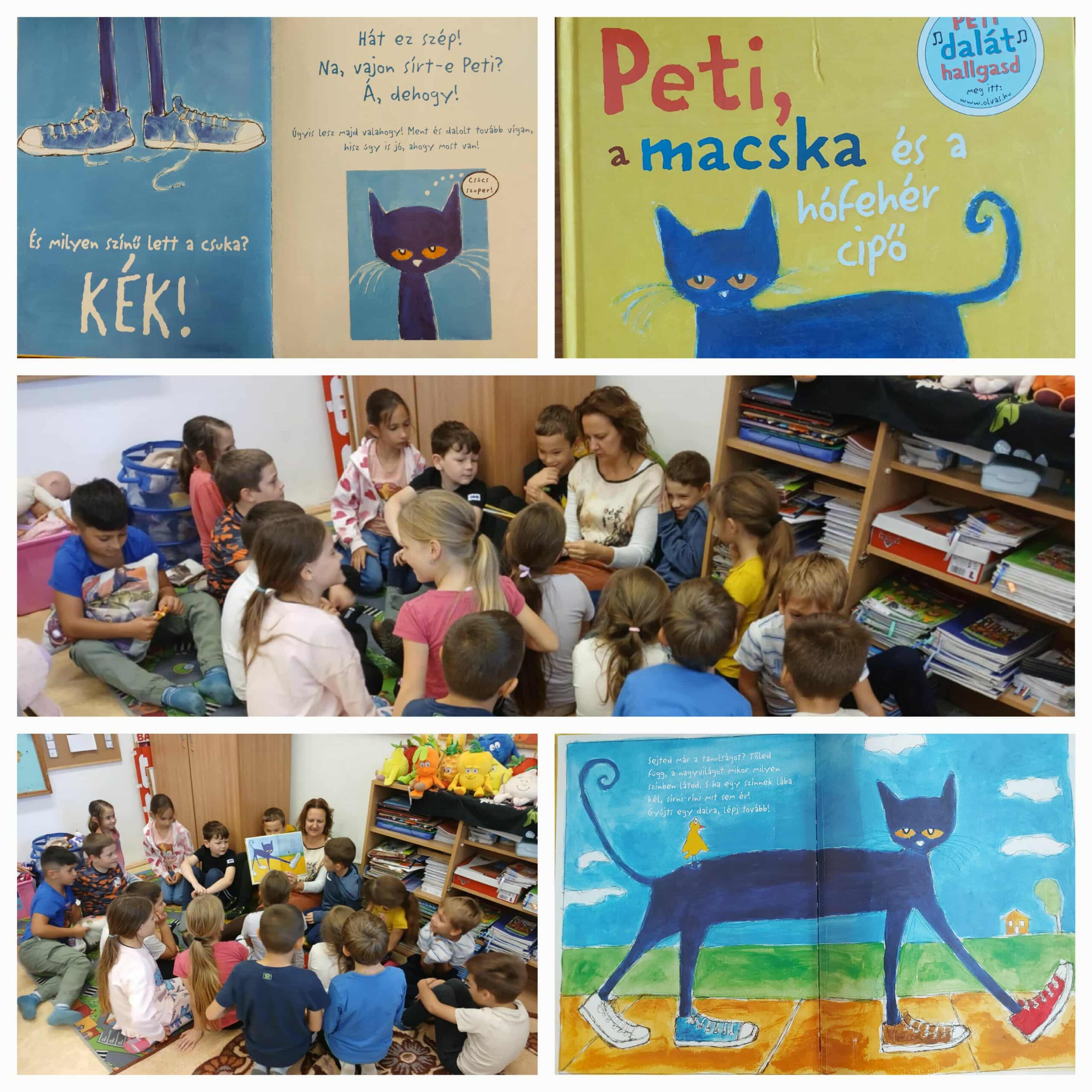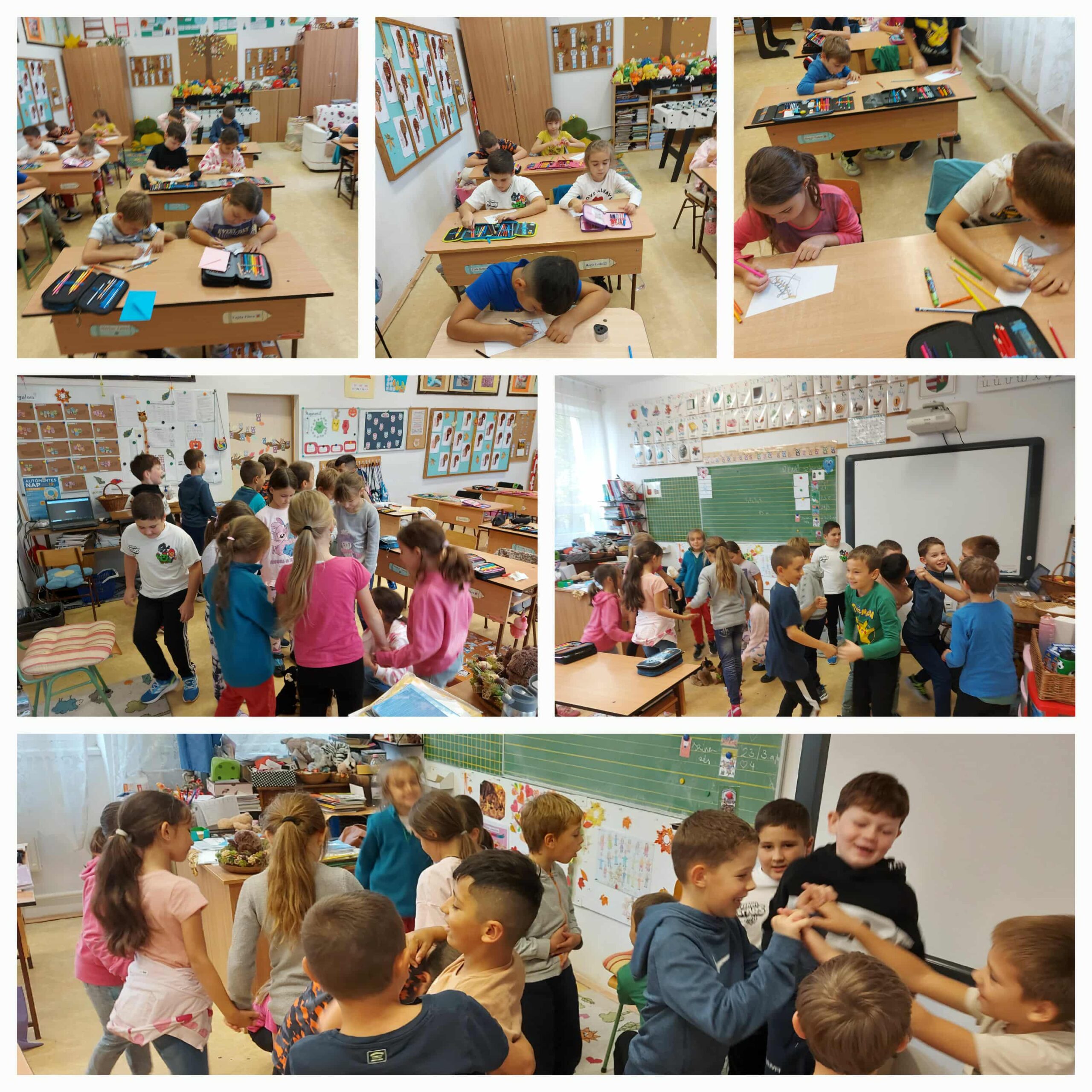 Az optimizmus témáját két tanítási órán dolgoztuk fel, de az ott készült kártyákat azóta is folyamatosan használjuk. Ráhangolódásként „Napimádás” és a „Hervad a virágom, éled a virágom” ralaxációs gyakorlattal kezdtünk. Aztán megbeszéltük az optimista szó jelentését, és hogy miért jó, ha optimista a gondolkodásunk, szemléletünk. Összegyűjtöttünk pozitív gondolatokat, mondatokat, amit majd a kártyákon fogunk felhasználni. Ezután következett a mesehallgatás (Eric Litwin: Peti, a macska és a hófehér cipő). Megbeszéltük a mese tanulságát. Mindenki kapott egy cipőt, amit kiszínezett kedve szerint. Közben többször meghallgattuk a hónap dalát. Az első órát meditációval zártuk.