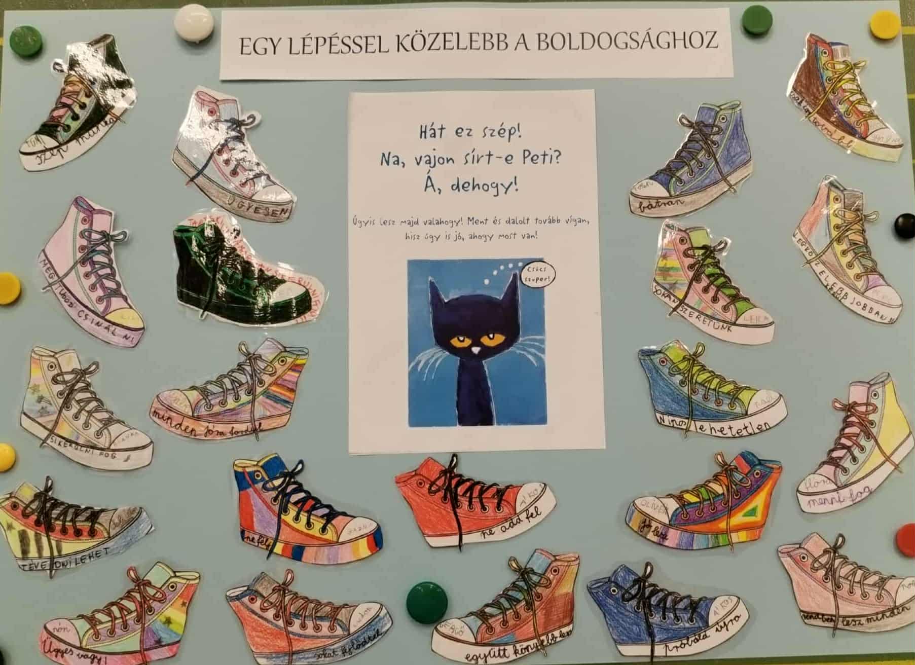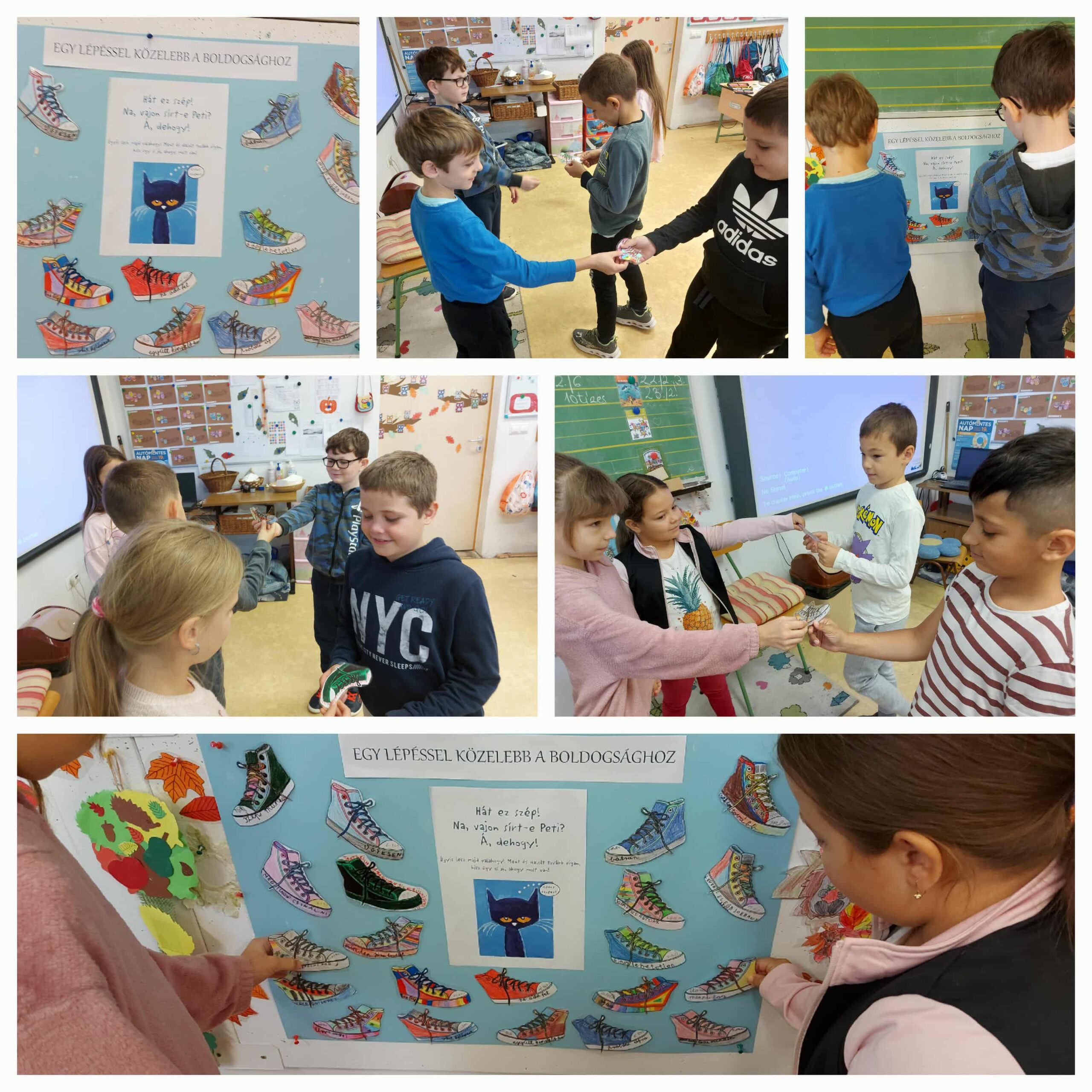 A második órán átbeszéltük ismét a témát, átolvastuk az összegyűjtött mondatokat. Mindenki kiválasztott egyet, amit ráírt a kiszínezett cipőjére, a kártyájára. Közben meghallgattuk a hónap dalát, majd táncoltak is rá. Lelamináltuk a cipőket, elkészítettük a tablót. Kitettük az osztályba, megbeszéltük, hogy a kártyákat annak adhatják majd, akiről úgy gondolják, szüksége van egy kis pozitív támogatásra. Örültem neki, hogy emlékeztek, hogy a tavalyi tanévben a bocsánatkérő kártyákat is így használtuk fel. Az óra végén megbeszéltük, hogy milyen gondolatokkal lettek gazdagabbak. Ezt az órát is meditációval zártuk.