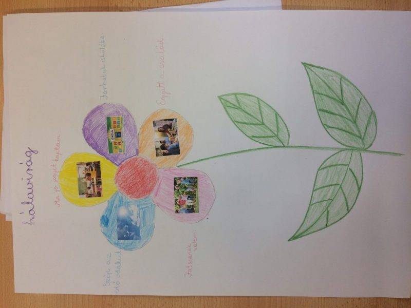 Több tanóra alatt dolgoztuk fel a hála témakörét. Közösen megfogalmaztuk, hogy mi a hála és a hála hatásait. Megbeszéltük, hogy miért lehetünk hálásak. Meghallgattuk Bagdi Bella hálához kapcsolódó zenéjét, Azt a feladatot kapták a gyerekek, hogy másnapig mi mindenért lehetnek hálásak és másnap az órát ennek megbeszélésével kezdtük. Ezután elkészítették az Ablak a világra című alkotásukat. Összefoglalásként megrajzoltuk a hálavirágot.