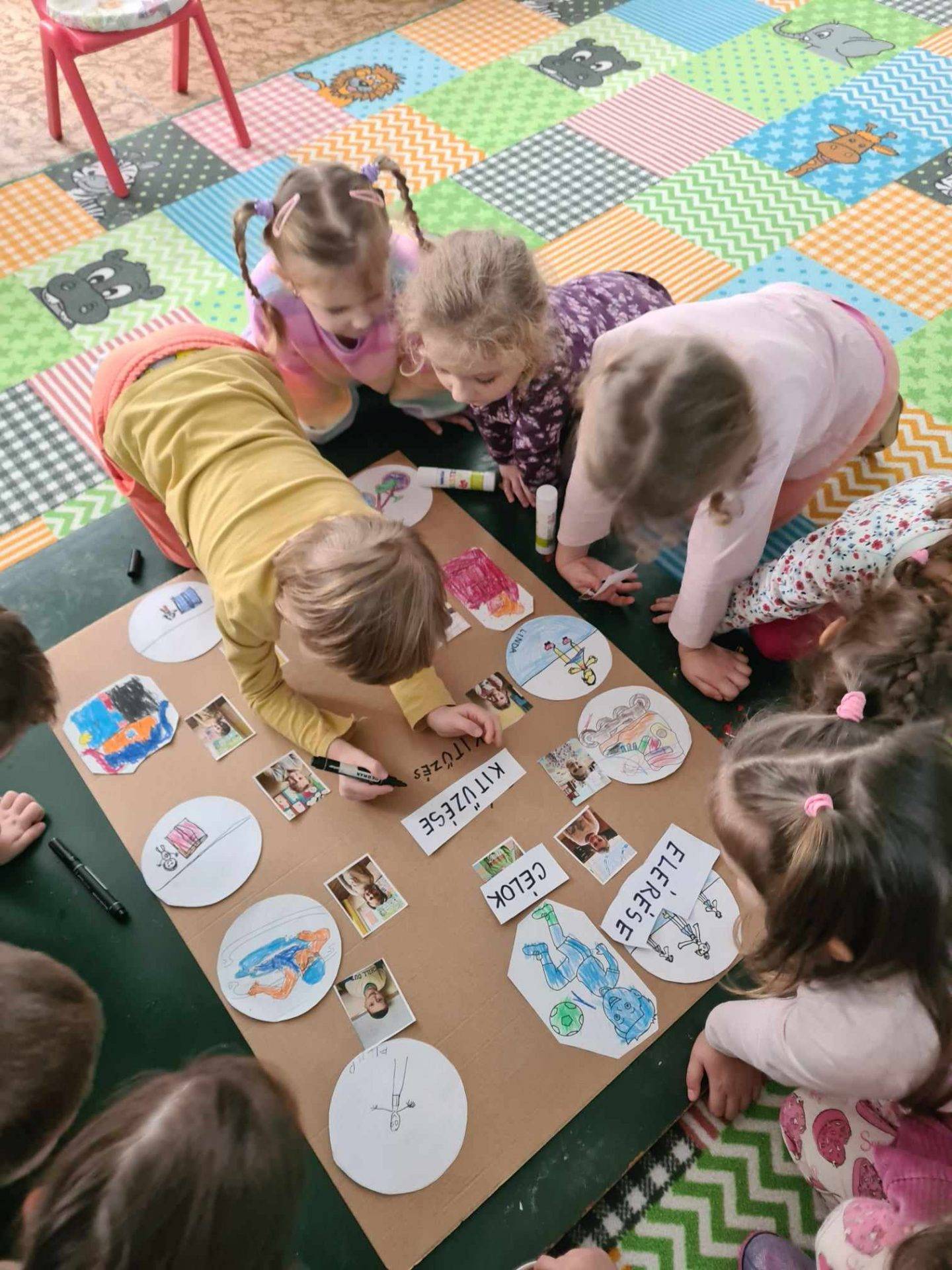 A foglalkozás kezdetén megismerkedtünk „A boldogság vára“ mesével, melynek tartalmát közösen elismételtük. A továbbiakban a gyermekek saját kitűzött céljaikat lerajzolták, kiszinezték és ráragasztották a közös rajzlapra.