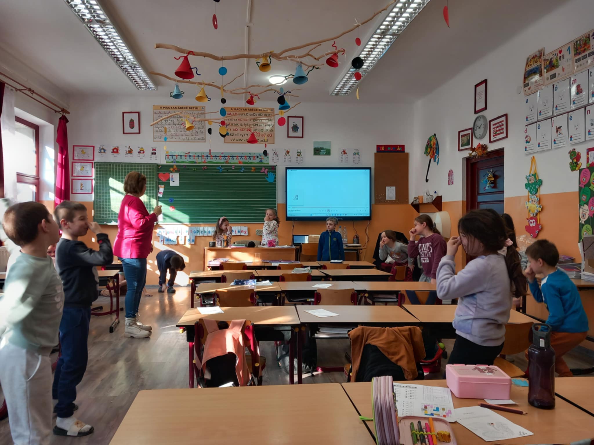 A tanító néni és a gyerekek megkértek, hogy az előző hónap dalát újra játsszuk el (Van nekem egy álmom). Mozogtunk is rá igaz, csak az osztályteremben körbe-körbe. Jó mulatság volt és egy kicsit megmozgattuk magunkat. A végére maradt annyi időnk, hogy a hónap dalára is relaxáltunk egy kicsit. Bagdi Bella: Ellazulni jaj de jó! című dalával zártuk az órát. Mi felnőttek is végeztük a gyakorlatokat a gyerekekkel együtt és jólesett egy kis ellazulás. A végére hagytam a Bagdi Bella Pillanat-kapitány könyvéből a számolásos légzést, amivel teljesen ellazultunk és visszatértünk a jelenbe, az osztályterembe. Sok dolog van, amiért meg kell küzdenünk, de együtt, egymást segítve minden sikerülhet. Mindenki a saját ütemében fejlődik és fejlődhet itt az első osztályban.