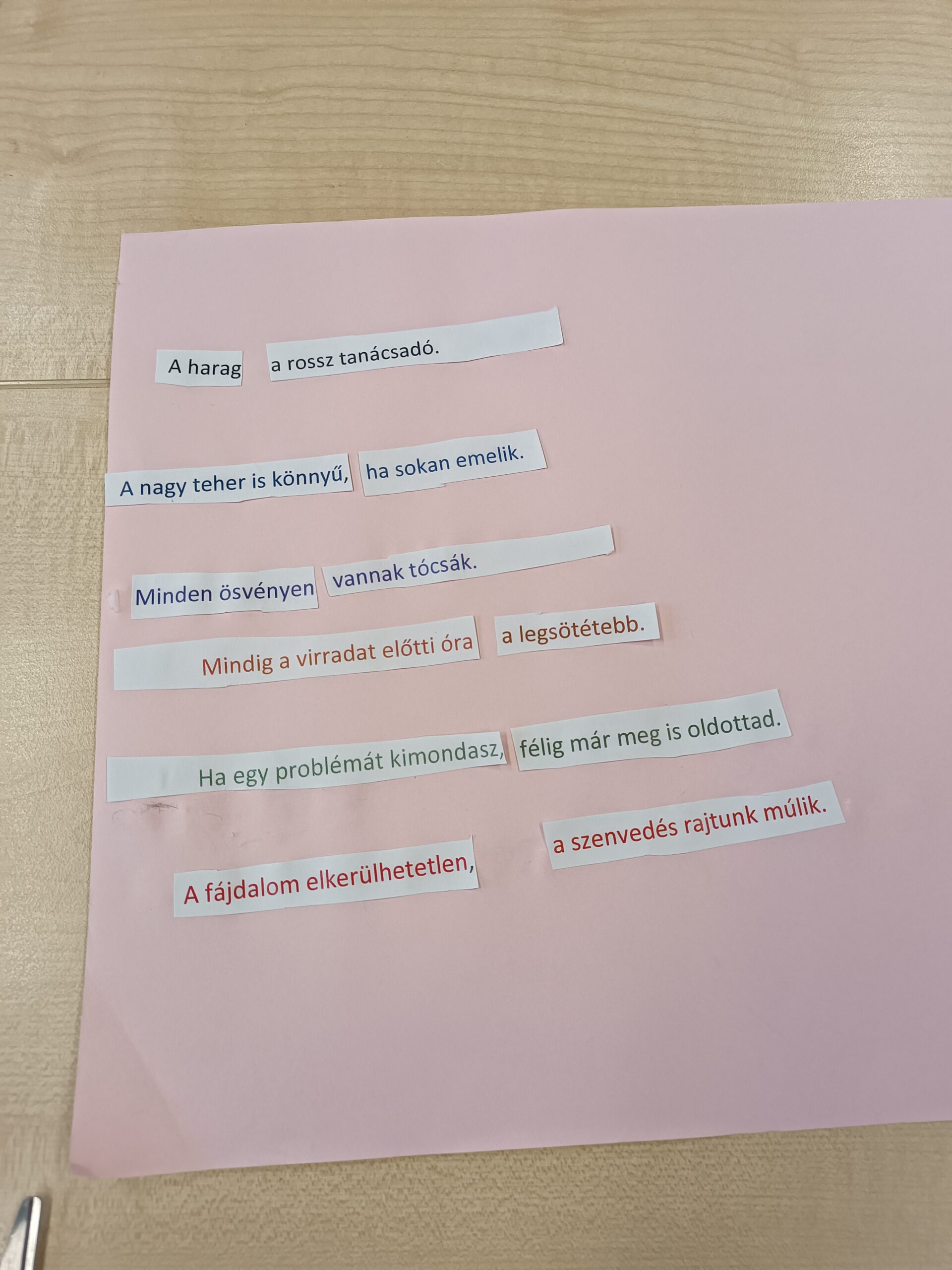A célok után jöhetett a megküzdési stratégiák átbeszélése. Ki, hogyan tud megoldani egy-egy problémát? Ez roppant nagy kérdés egy 8 évesnek. Először is a színezős feladatot oldottuk meg csoportosan. nagyon oda kellett figyelni , hogy mennyit dobnak, az milyen színű és ki színezi. Nagy verseny lett a végén, hogy ki mennyit fog kiszínezni. Utána a szólások kirakása következett. Mindegyiket átbeszéltük, majd példákat kerestünk rá. A foglalkozást közös énekléssel fejeztük be.