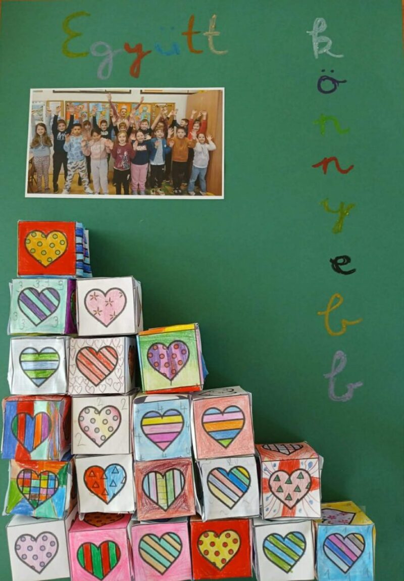 A harmadik foglalkozáson kivágták a kockákat és összeragasztották. Az elkészült kockákból lépcsőt raktunk össze, a lépcső tetejére egy osztályképet tettünk, amin jelképesen örülünk, hogy együtt sikerült megküzdenünk/leküzdenünk az előttünk álló problémát/akadályt. A harmadik óra végén minden gyerek megfogalmazta, hogy milyen gondolattal lett gazdagabb.