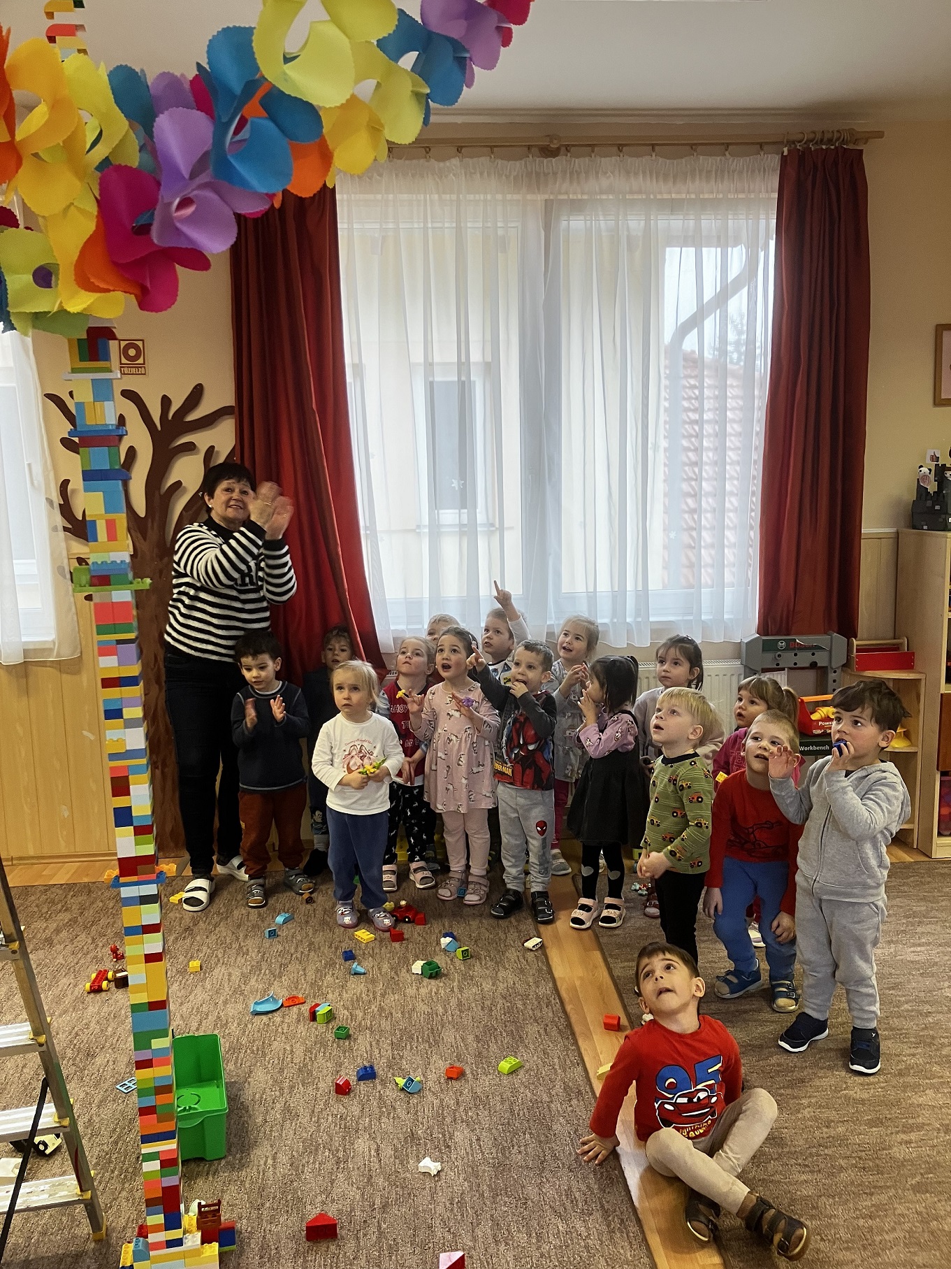 Persze a beszélgetést felváltotta a közös játék. Elhatároztuk, hogy mi is építünk egy hatalmas tornyot. A miénk a csoportszoba tetejéig ért. Örömmel töltött el minket, felnőtteket, ahogy minden gyermek aktívan készítette a kicsi tornyokat, amiket lelkesen hozott a közös, egyre magasodó toronyhoz, amit végül már én is csak a létra tetejéről értem el. A gyerekek nagyon büszkék voltak a tornyunkra (még a rendrakás is gyorsan ment utána 🙂 ).