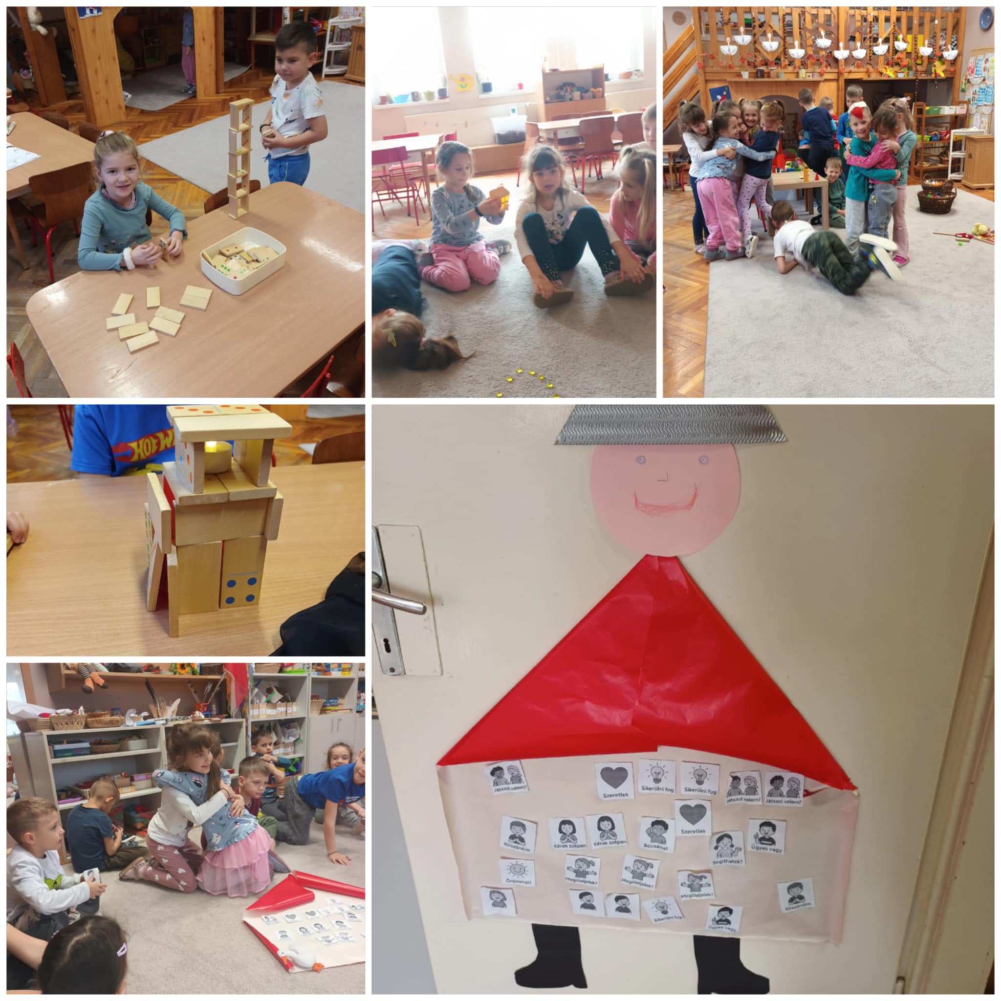 Ebben az ünnepkörben, a szeretet ünnepe felé közeledve, nagyon fontosnak tartom az érzelmi világ megláttatását is a gyerekekkel, még ha nem is olyan egyszerű sokszor. A kedves- szavak kosara nagy segítség volt ebben, vagy a szeretet- lámpás adogatása, miközben a mondóka végén mindenkinek mondania kellett a másiknak valami kedveset, szépet, jókívánságot. A kosárban szereplő képecskék talán még meg is könnyítették a gyerekeknek megérteni a szavak jelentését. Miután mindenki kiválasztotta a neki tetsző képecskét, és elmondtuk, melyik mit jelent, valamelyik társukhoz lépve kellett megfogalmazni a képecskén szereplő mondatot. Nem volt könnyű szavakba önteni érzéseinket, hogy miért is/ mit szeretünk a másikban, vagy mit tennénk meg érte örömmel, de úgy gondolom, azért megbirkóztunk vele. Szent Márton köpenyét díszítettük vele, ami a mai napig csoportszobánk ajtaján emlékezteti az arra járókat a „varázsszavak” használatának fontosságára.