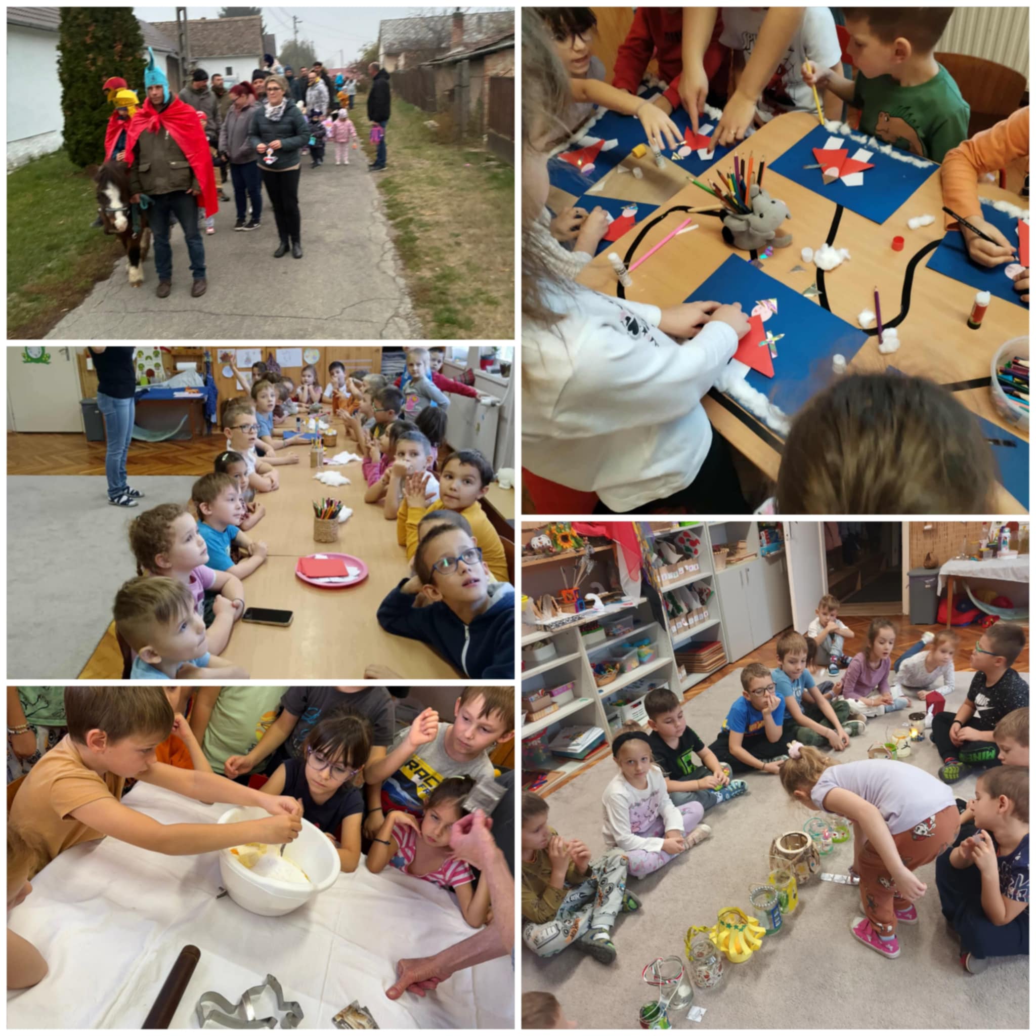 Az ünnepségre a csoporttal és dadus nénink segítségével közösen elkészítettük a finom „sült liba” linzereket, amivel az odaérkezőket is meg tudtuk kínálni a hagyományos forró tea és zsíros kenyér mellett. Idén nem csak a családok és az óvoda, iskola éneke zengte be a falu kis utcáit, hanem lovasoktatónk meghívásunknak eleget téve, patakopogás vezette a kígyózó sort Szent Mártonnal a hátán a Kultúrház udvaráig, ahol kezdetét vette a közös ünneplés.