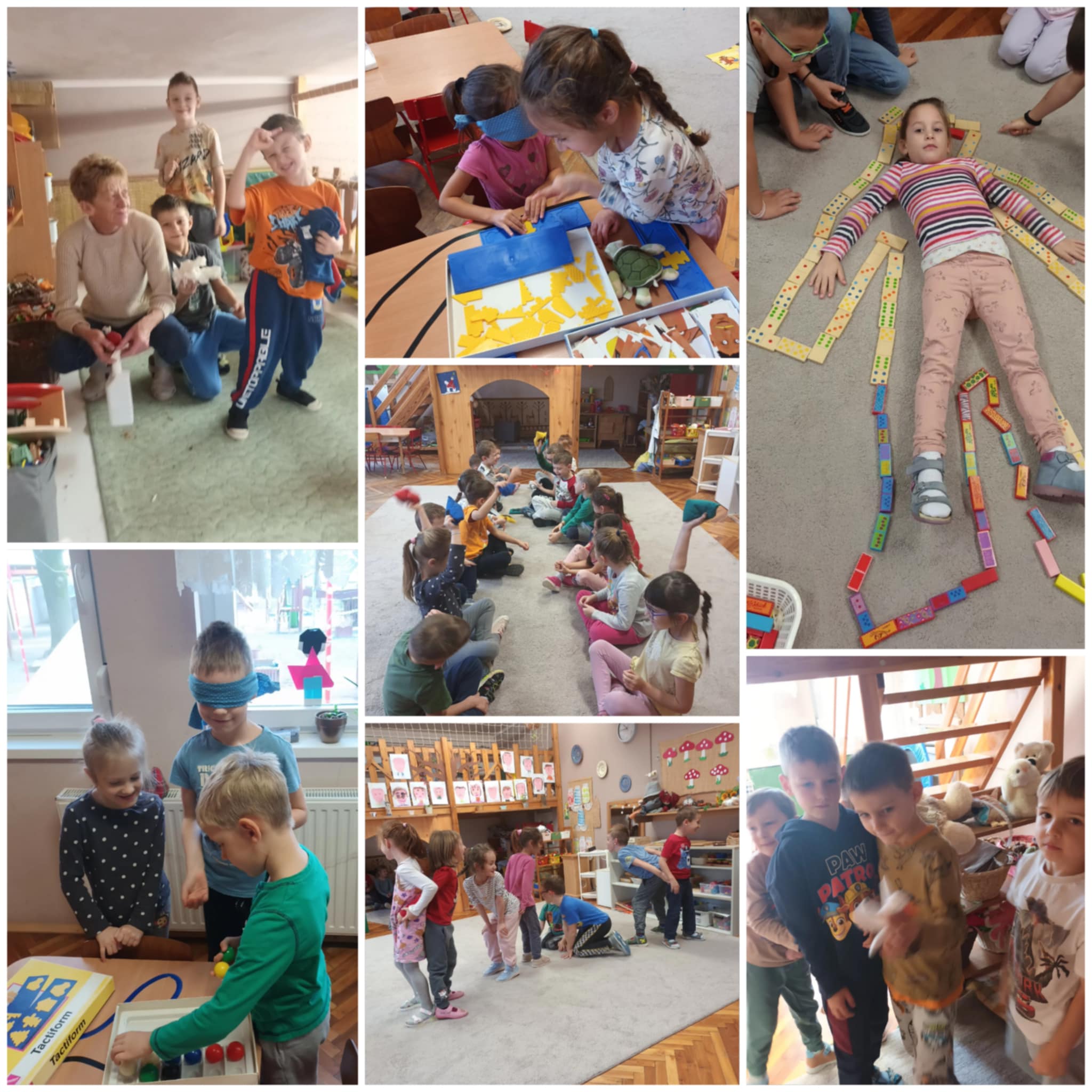 A dominónap alkalmából különböző dominóépítményeket építettünk, amelyekbe még lámpásokat is elrejtettek a gyerekek, vagy így november vége felé a testünk témakört körüljárva rakták egymást ki dominókockák segítségével.
