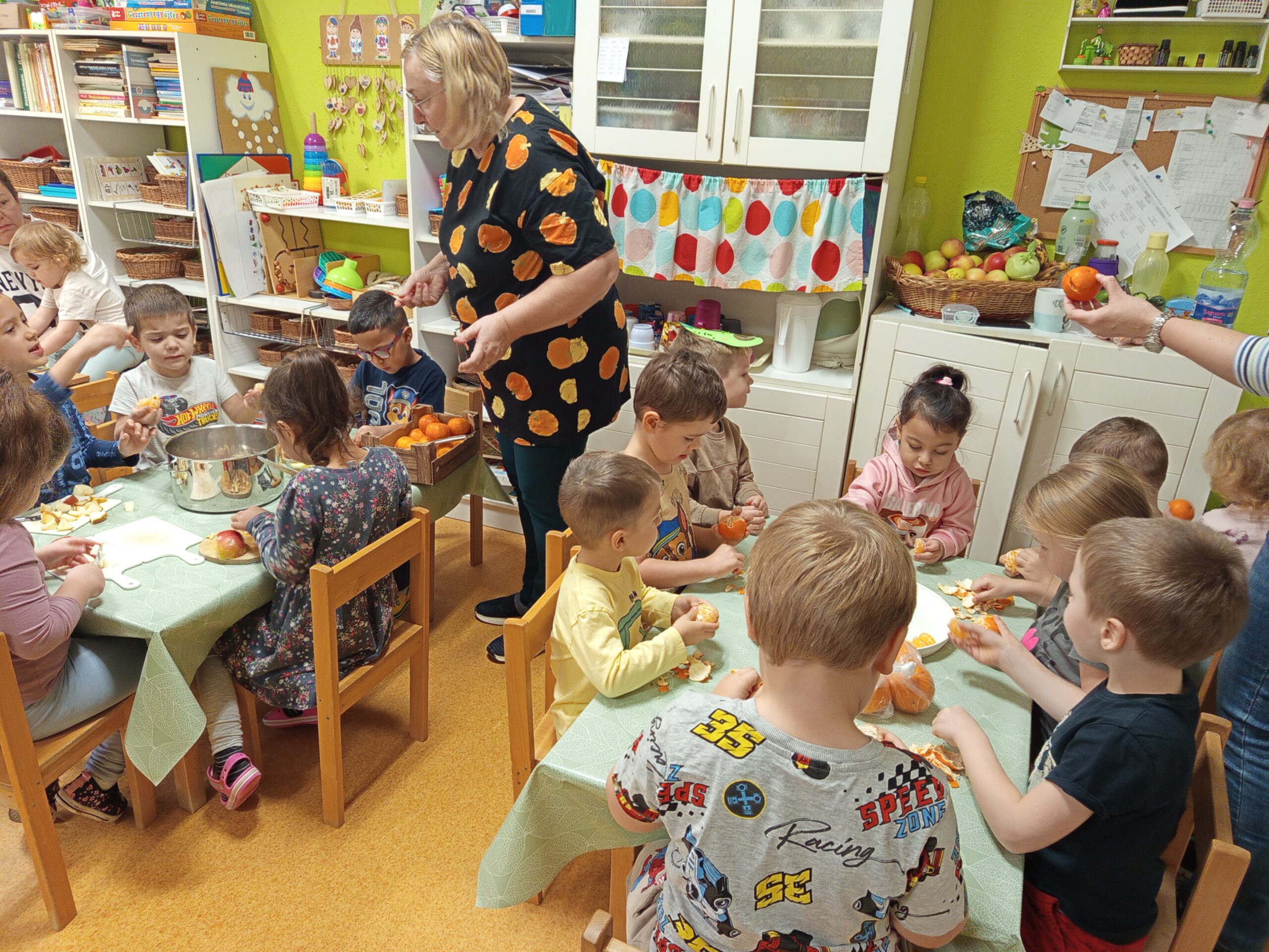 A novemberi tematikából megint szemezgettem, Boldog Dóri elmesélte a történetét, hogy hogyan segítettek egymásnak Vidám Vilivel, a testvérével, majd megbeszéltük, hogy mi hogyan tudunk segíteni egymásnak, és mikor? Az elpakoláskor együttműködve gyorsabban elkészülünk, elosztódik a munka, kevesebb jut egy személyre. Nagyon szép példákat láttam ezen a területen. Egy kiscsoportos kisfiúnk különösen érzékeny mások segítésére, volt, hogy öltözéskor segített megigazítani szintén kiscsoportos társának a pulóverét. Az egészség tematika feldolgozásában egy projektben vettünk részt, ahol nyitott délelőtt alkalmával egészséges ételeket készítettünk közösen, a szülők részvételével. Itt is volt csapatmunka, differenciáltan, a nagyobbak késsel szeletelték az almát, a kisebbek mandarint, narancsot hámoztak, így készült közösen a gyümölcsös puncs ital. Mindennapos mozgás ideje alatt pedig a labdaadogató játékot játszottuk, vegyes csoportban, a legkisebbek is nagyon élvezték, többször is kellett játszanunk. Mivel több kiscsoportos gyermekünk van, akik még nem ismerik a boldogságórák témáit, így az alapprogramból a Szomorú Szilárd- Boldog Blanka jelképeket is elővettem, két smile formájában, két csapatot alakítottam, ahol minden korosztály vegyesen volt, és voltunk szomorúak, akiket fel kellett vidítani, és fordítva is. Ezt a játékot is nagyon élvezték.