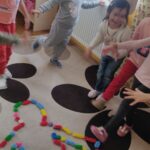Ebben a hónapban barátságot kötöttünk más csoportbéli gyerekkel.Beszélgettünk arról ,hogy feladatunk óvodánk születésnapi műsorán szerepelni.Ismerkedős játékot játszhattunk a próba előtt,hogy megismerjük egymás nevét,bemutatkoztunk egymásnak.Egy -kettő-három,négy te kis cica hová mégy?Kipp -kopp kopogok, óvodába indulok .Akihez értem a bábbal ,annak megkérdeztem a nevét.Nyávogva,,Miaú én Cirmi vagyok!Téged ,hogy hívnak ?A választott gyerek mondta a nevét,
