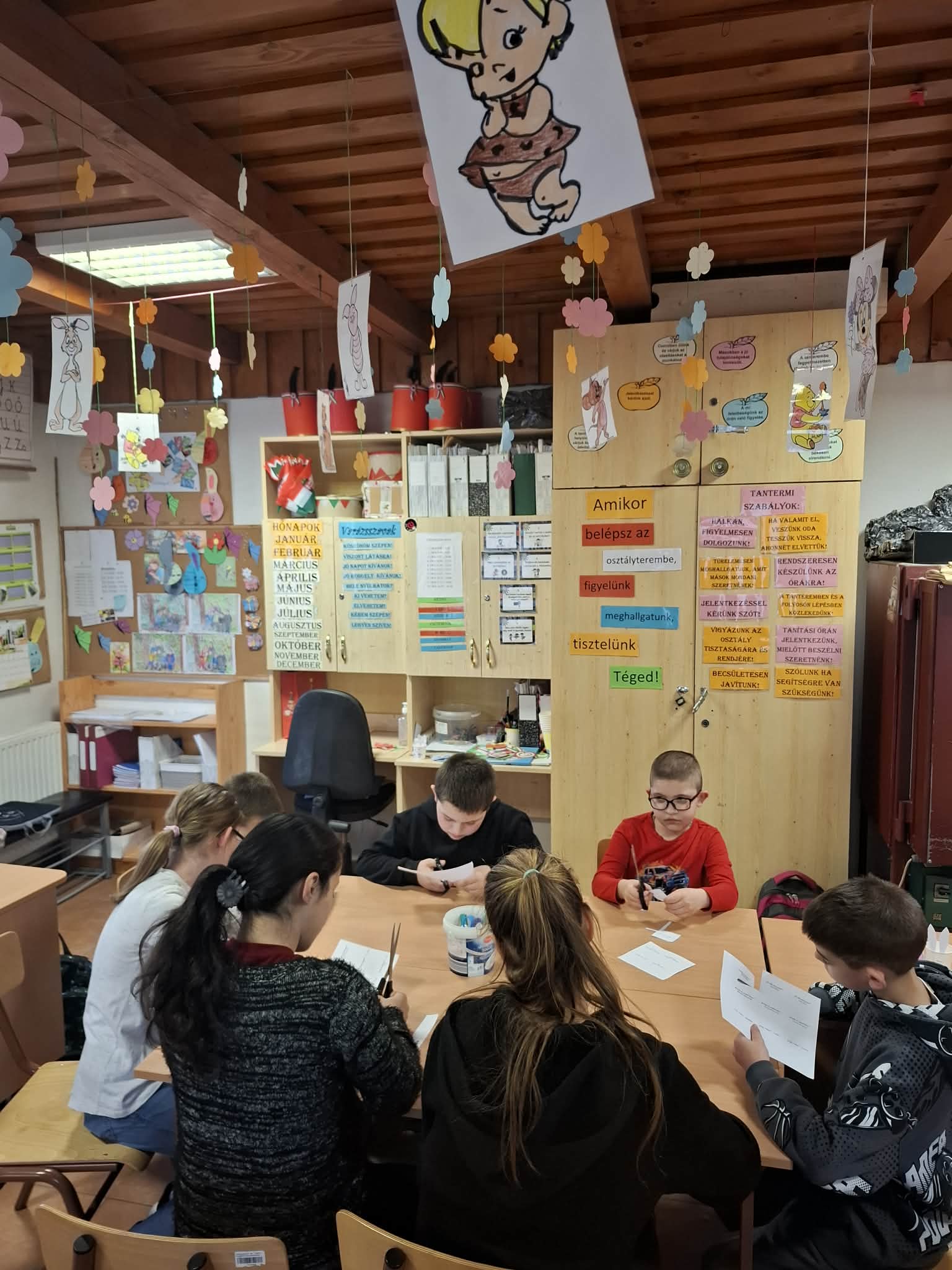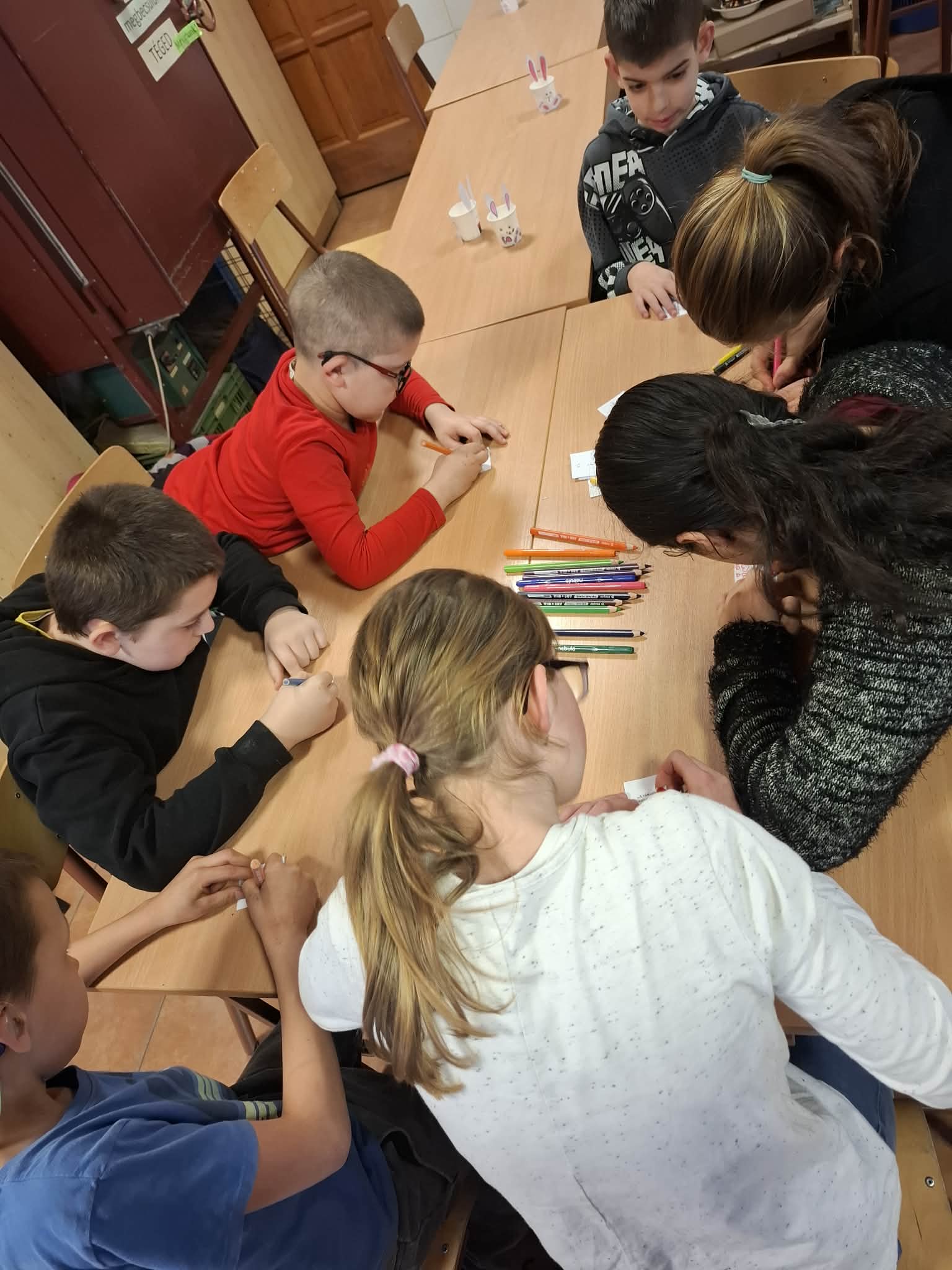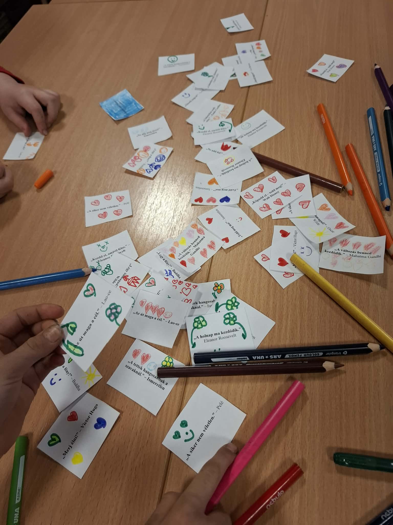 A Boldogság Világnapjához kapcsolódva, március 20-án kedvességkampányt is megvalósítottam. A tanulók közösen készítettek és díszítettek „BÓK-kártyákat”, amelyeket még aznap meg is osztottak másokkal: jutott belőlük parkoló autókra, járókelőknek, postaládákba, néhány iskolai dolgozónak is. A bók-kártyák készítése és átadása során a gyerekek megtapasztalhatták, hogy apró figyelmességekkel is örömet lehet szerezni másoknak. A közös tevékenység erősítette az egymásra figyelést és a közösségi élményt, miközben teret adott a kreatív önkifejezésnek is.