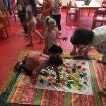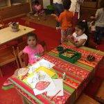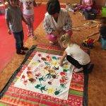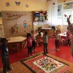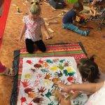 A gyerekek nagy örömmel festették be a tenyerüket, s közben beszélgettünk az ősz színeiről. Elmondtuk a kis mondókát: ,,Fújja a szél a fákat…” Festés közben a gyerekek örömmel mutatták egymásnak a befestett tenyereiket. Előző napon elmeséltem a Hálafa történetét is.