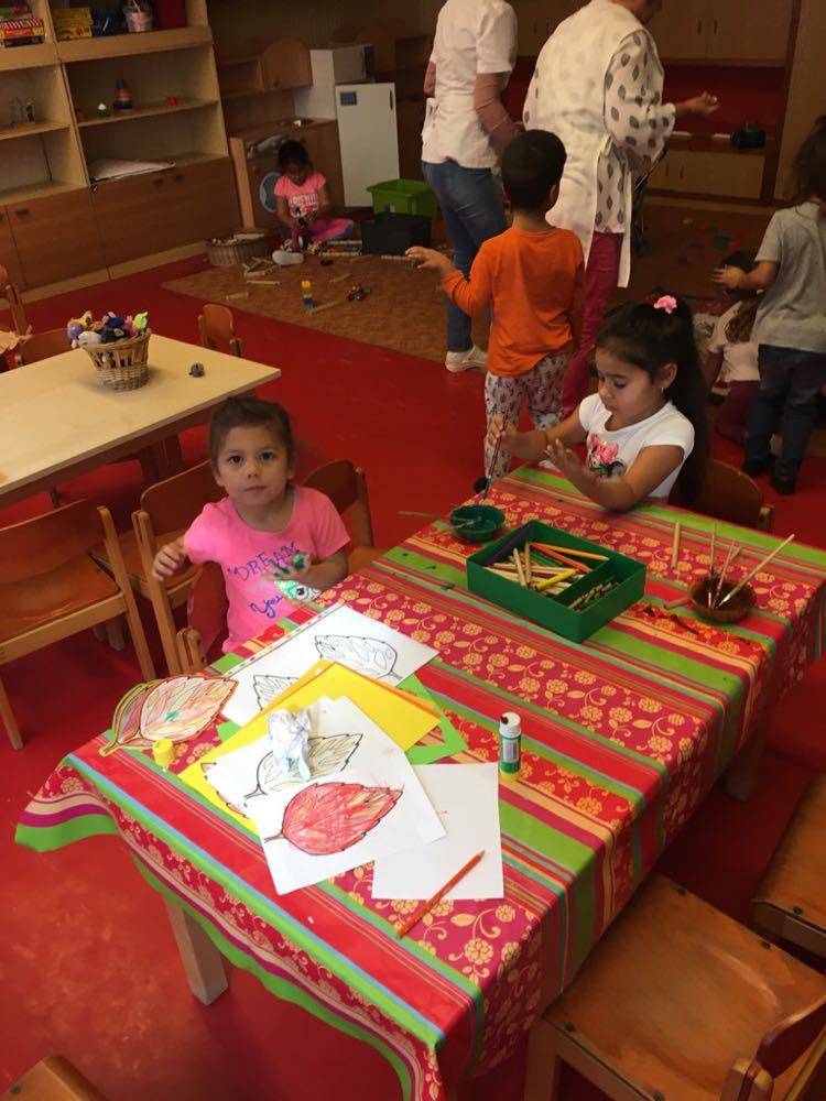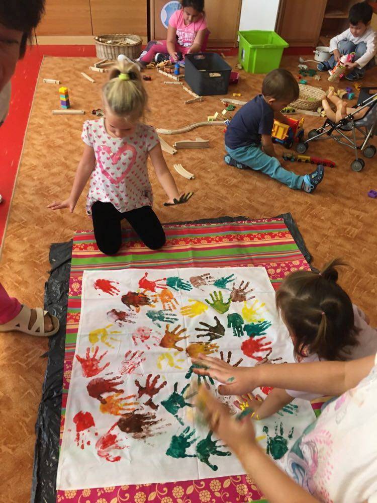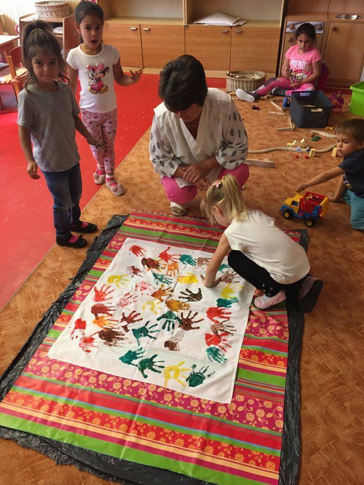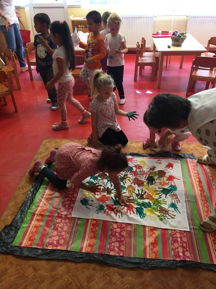 A gyerekek nagy örömmel festették be a tenyerüket, s közben beszélgettünk az ősz színeiről. Elmondtuk a kis mondókát: ,,Fújja a szél a fákat…” Festés közben a gyerekek örömmel mutatták egymásnak a befestett tenyereiket. Előző napon elmeséltem a Hálafa történetét is.