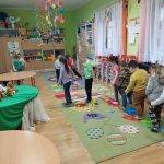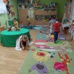 A medve hétre a gyerekek hoztak kisebb, nagyobb plüss mackókat és medvebarlangot készítettünk nekik. Nagyon kedvelik, az ilyen helyeket. Mi az egyik körasztalt terítettük le, aminek volt egy bejárata és egy kijárata. Felhasználtuk az építéshez a műanyag kockákat is. Nagyon szeretnek építeni, kis területeket kijelölni a játék számára.