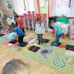 Az Aranykulcs című (Bezzeg Andrea) mesét használtuk fel a játékhoz. A medve barlanghoz egy labirintuson keresztül vezet az út. Hogy megtaláljuk a plüss mackóinkat, végig kellett menni nehéz terepen, a gyalogösvényen. Feladatokat kellett megoldani a fejlesztő játékkal a Mozgáskotta elnevezésű kis négyzeteken végig lépkedve. Jobb láb, bal láb, ugrálás, számolás, békaugrás, forgás. Mindenféle mozgásforma megtalálható benne. Nagy figyelmet igényel, de közben jól érzi magát a gyermek. Volt, aki felnőtt segítségét kérte, ha nem sikerült az egy lábon való ugrálás. Amikor ezeken túljutottunk, akkor át kellett úszni egy kis folyón. Egy kék színű ruhát terítettünk a szőnyegre, ami a folyó volt. Amikor mindezeken átjutottunk, akkor még mindig voltak előttünk akadályok, de ahogy azokat is leküzdöttük, megláttuk a barlang bejáratát, ahol megtaláltuk a mackóinkat. Nagyon tetszett a gyerekeknek, ezért többször is körbementek, vagyis megpróbáltak a labirintuson túljutni. Az egész hetünk jó hangulatban telt.