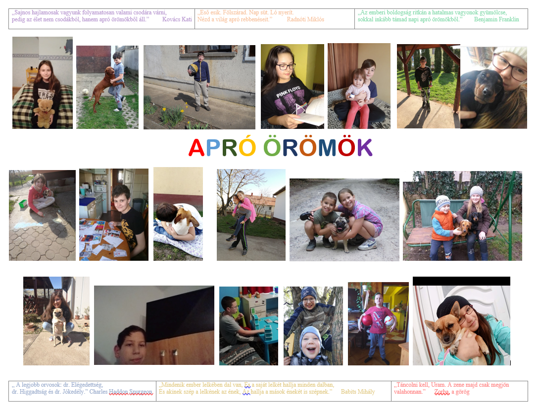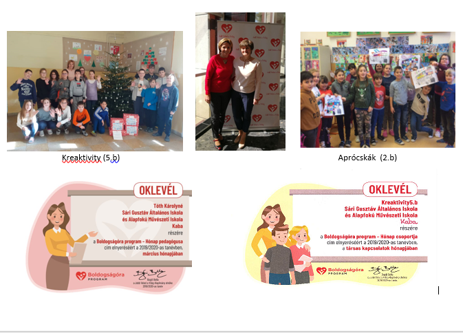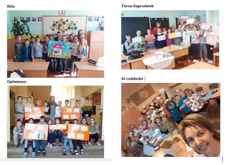 A Boldogságóra programot a Jobb Veled a Világ Alapítvány működteti, melynek Bagdi Bella az elnöke. Ez a pozitív pszichológia kutatási eredményeire épített élménypedagógiai módszertan. Mind a tanárok, mind a gyermekek lelki jóllétével foglalkozik. Jó kiegészítője lehet az iskolai munkának, hiszen segítségével lehetőség nyílik arra, hogy a hagyományos tudásmegosztást és az életben szükséges személyes és szociális kompetenciák fejlesztését összhangba hozzuk. A boldogságszintünket alapvetően két tényező határozza meg: a pozitív érzelmek előállításának a képessége (függetlenül a külső körülményektől), és a megküzdési stratégiáknak a fejlettségi szintje (mennyire tudunk hatékonyan alkalmazkodni az élet kihívásaihoz). A mentális egészségünk megőrzése a kezünkben van, melynek védelmében foglalkoznunk kell a boldogsággal is. Kevesen tudják, hogy a pozitív érzelmek sokkal többet tesznek értünk annál, mint hogy jól érezzük magunkat a bőrünkben. Kutatók szerint a pozitív érzelmek csökkentik a stresszt, segítenek feldolgozni a problémákat, erősítik az immunrendszert, védik a szívet, egészségesebb élethez segítenek hozzá. Ezek mellett fontos a lelki ellenálló képességünk fejlesztése. Foglalkoznunk kell ezzel is, hogy talpon maradhassunk a megpróbáltatások közepette is. A program kiemelt küldetése, hogy a pozitív pszichológia eredményeire épít, ad ötleteket, módszereket a boldogságra való képesség fejlesztéséhez mind az óvodás, mind az iskolás korosztálynak. A módszer „házigazdái” egy kidolgozott programot adnak át nekünk. A feldolgozást segítik könyvek, társasjátékok, kártyák, a honlapjukról ingyenesen letölthető anyagok. A családok részére ott van a Jobb veled a világ otthon oldal, ahol ingyenesen tudnak letölteni otthon megvalósítható játékos feladatokat. Pedagógusok számára van egy online feladatbank. Továbbá egy olyan tudástár is elérhető felnőtteknek, amelynek célja a mentális egészség megőrzése. Ezek elérhetőek a boldogsagora.hu oldalon a #jobbveledavilagotthon menüpont alatt, a felnőtteknek, idősebbeknek szóló tudástár pedig a jobbveledavilag.hu oldalon található. Fontos szem előtt tartani, hogy minden helyzet egy fejlődési lehetőséget nyújt számunkra. Nagyon meghatározza a munkánkat az együttműködés, egymásra való odafigyelés. A program a tanév minden hónapjában olyan témát jár körül, mely segíti és támogatja a gyerekeket a hétköznapi problémákkal való megküzdésben. A folyamatos önismereti fejlesztéssel és a boldogságérzetet fokozó technikák bemutatásával személyes, lelki egészségüket is tápláló kompetenciáikat fejleszti. A boldogságórák célja nem az, hogy problémamentes életmodellt állítson a fiatalok elé, hanem hogy vezérfonalat adjon az iskolásoknak, hogy könnyebben nézzenek szembe a kihívásokkal, képesek legyenek megbirkózni a problémákkal, valamint hogy lehetőséget adjon a testi-lelki egészség megtartásához szükséges tényezők tanulmányozására és tudatosítására. A cél olyan optimista, magabiztos és kitartó gyermekek nevelése, akik megoldandó feladatként kezelik a mindennapi kihívásokat, észreveszik az élet szépségeit, az örömteli pillanatokat, és boldog, határozott, pozitív énképpel rendelkező iskolássá, majd felnőtté válna. A programban 100 ezer gyermek és közel 7 ezer pedagógus vesz részt. A program nagykövetei: Sebestyén Balázs, Zséda, Erős Antónia, Vida Ági, prof. dr. Bagdy Emőke (fővédnök), Palya Bea, Wolf Kati, Szalay Ádám, Mádai Vivien. Négy korcsoport van: óvodás, alsós, felsős és középiskolás. Tíz egymásra épülő témát kell feldolgozni hónapról hónapra: hála, optimizmus, társas kapcsolatok, boldogító jócselekedetek, célok, megküzdés, apró örömök, megbocsátás, egészséges életmód, fenntartható boldogság. Iskolánkból Gyányiné Székely Viola intézményvezető (a 2. b osztállyal) és jómagam (az 5. b osztállyal) veszek részt ebben a programban. Azoknak a csoportoknak a munkái közül, melyek az elvégzett feladatokról küldtek be beszámolót határidőre, minden hónapban választanak ki olyanokat, melyek valamiért különösen érdekesek vagy fontosak voltak. Itt választották ki a mi iskolánk munkáját (az 5. b) a társas kapcsolatok témakörnél (tánc Bagdi Bella dalára). A Boldogságóra programban hagyomány, hogy havonta megnevezzük „a hónap pedagógusait”, akiknek az adott téma feldolgozása során a leginkább sikerült megmutatniuk kreativitásukat, ötletességüket, elhivatottságukat vagy valamilyen más erősségüket. Itt az apró örömök témában választottak ki engem az 5. b munkájával. Meg kell vallanom, hogy csak a kezdeteknél izgultam, tartottam attól, hogyan fogom megvalósítani a programot. A csoportunk, az 5. b etika csoportja már az első foglalkozáson megmutatta, hogy milyen kreatív, ügyes, ötletes. Nekem a hónap témáit kell felvezetnem, melyhez segítséget ad a program. A gyerekek a beküldendő feladat megbeszélése során szinte szárnyalnak ötleteikkel, nyugodtan rájuk bízhatom magam. Ráadásul egy nagyon aktív, segítőkész szülői háttér segíti munkánkat. Tóth Károlyné BOLDOG pedagógus