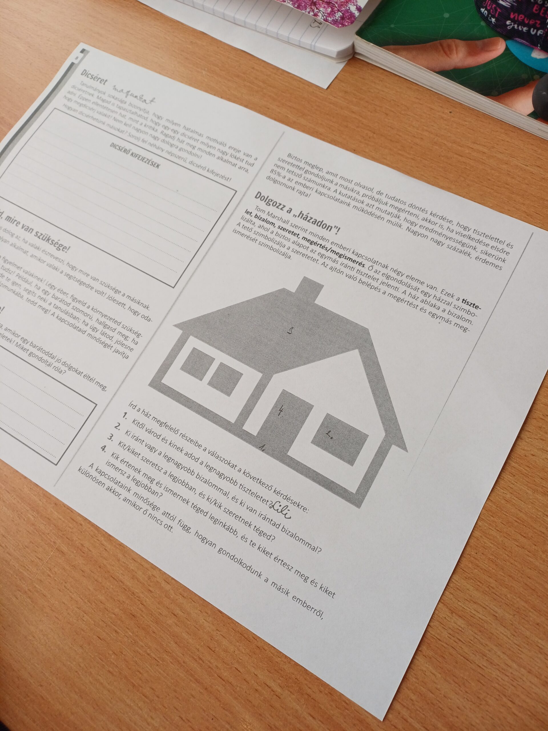 Az őszi szünetről visszatérve elég nehéz a visszarázódás a hétköznapokba. Úgy gondoltam inkább előbbrébb hozzuk a hónap témáját, talán szívesebben foglalkoznak a diákjaim számukra fontos és érdekes témákkal. A társas kapcsolatok ápolása ilyen. Rövid bevezetést tartottunk a hónap színezője kapcsán , elemeztük a rajta szereplő idézetet. Mitől barát a barát?- kérdésre kerestük a válaszokat. A munkafüzetből a Mennyire ismeritek egymást? feladatot választottam, a Jobb veled a világ dalt hallgatva gyűjtöttek aláírásokat. Nagyon produktív volt ez a feladat, komolyan vették. A felolvasásokból kiderült, hogy valóban ismerik egymást, és nagyon pozitív tapasztalat volt számomra, hogy elfogadóak voltak, nem minősítettek senkit, és nem volt gúnyolódás sem köztük-ami elég gyakran elő szokott fordulni. A barátságötöst is nagyon komolyan vették, remekül összegyűjtötték a barátság hozzvalóit. Tetszett nekik ez a feladat is. Meghallgatták a Görög mesét a barátságról, megbeszéltük a tapasztalatokat, tanulságokat, feljegyeztük a hármas szűrő elemeit. Majd önálló feladatot kaptak, a kapcsolatok házának felépítése és a dicséret volt az óra záró részében. Sajnos idő hiányában a kártyákra nem tudtunk sort keríteni, azt otthon fejezik be és a következő órán megbeszéljük a feladatok megoldásaival együtt. Végül egy Bizalomkör 2-vel zártuk az órát.