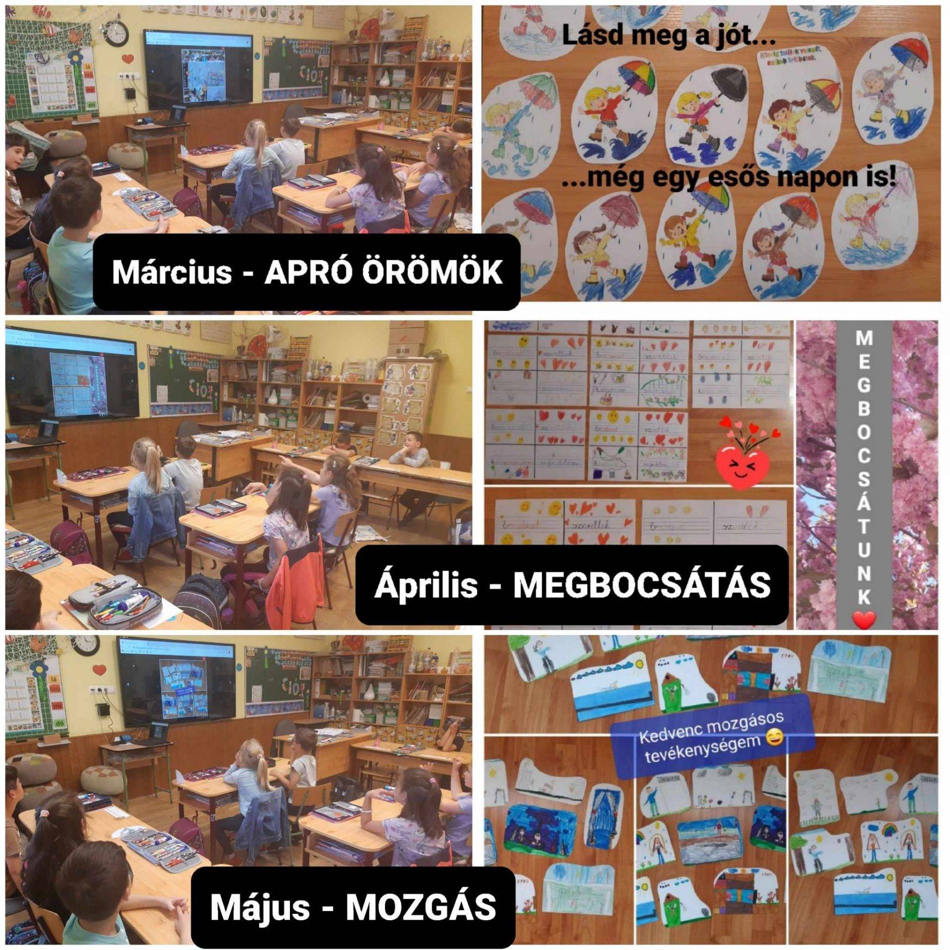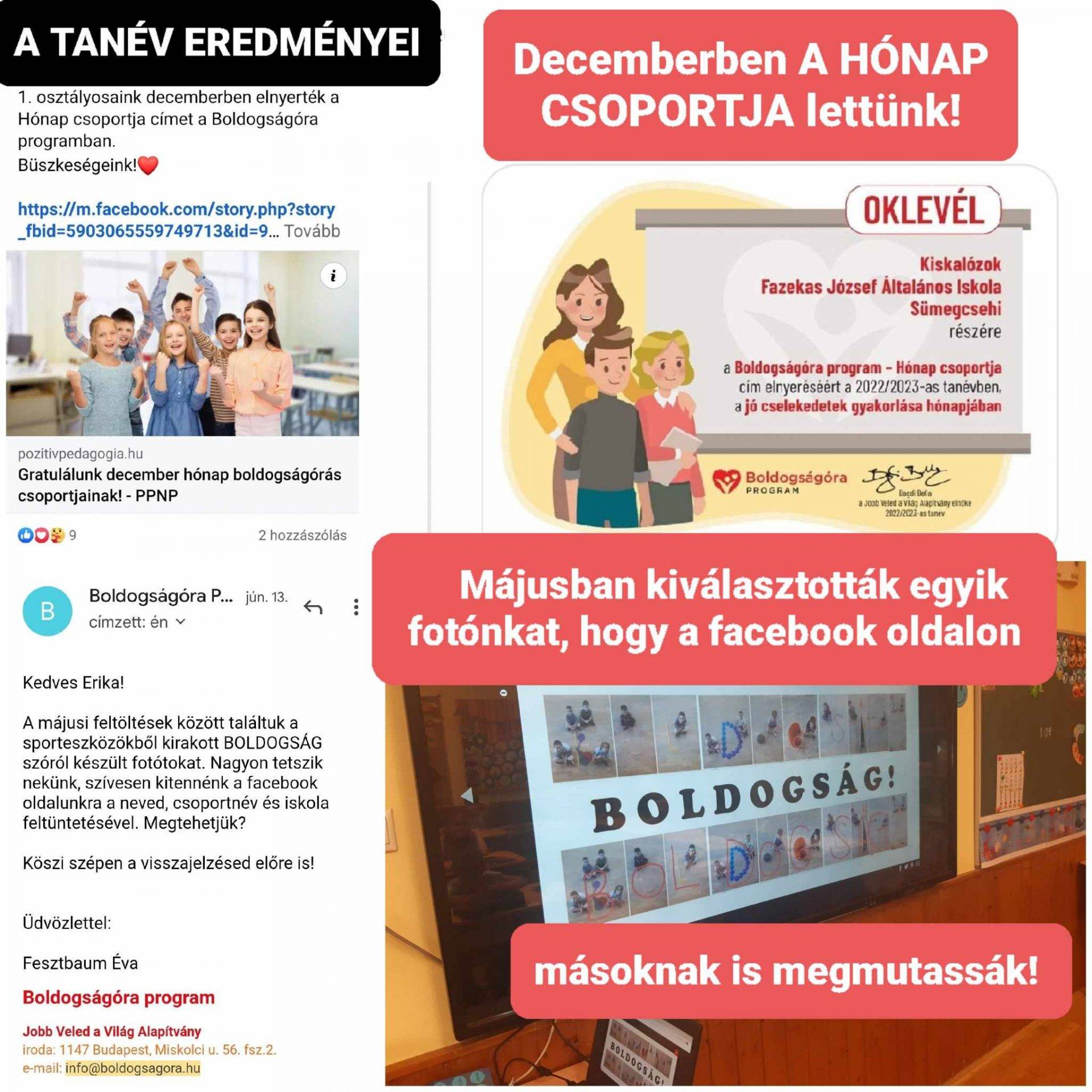 Elismert eredményekkel is büszkélkedhetünk a tanév lezárásakor: decemberben a hónap csoportja lettünk, májusban egyik fotónk nyerte el a boldogságórás csapat tetszését. Ezek az eredmények is hozzájárultak boldogságunkhoz, megerősítettek minket abban, hogy jó úton járunk, a havi egy-két-három boldogságóra a javunkra válik, így közösen elhatároztuk, hogy jövőre is minden hónapban szánunk időt a boldogság „tanulására”!
