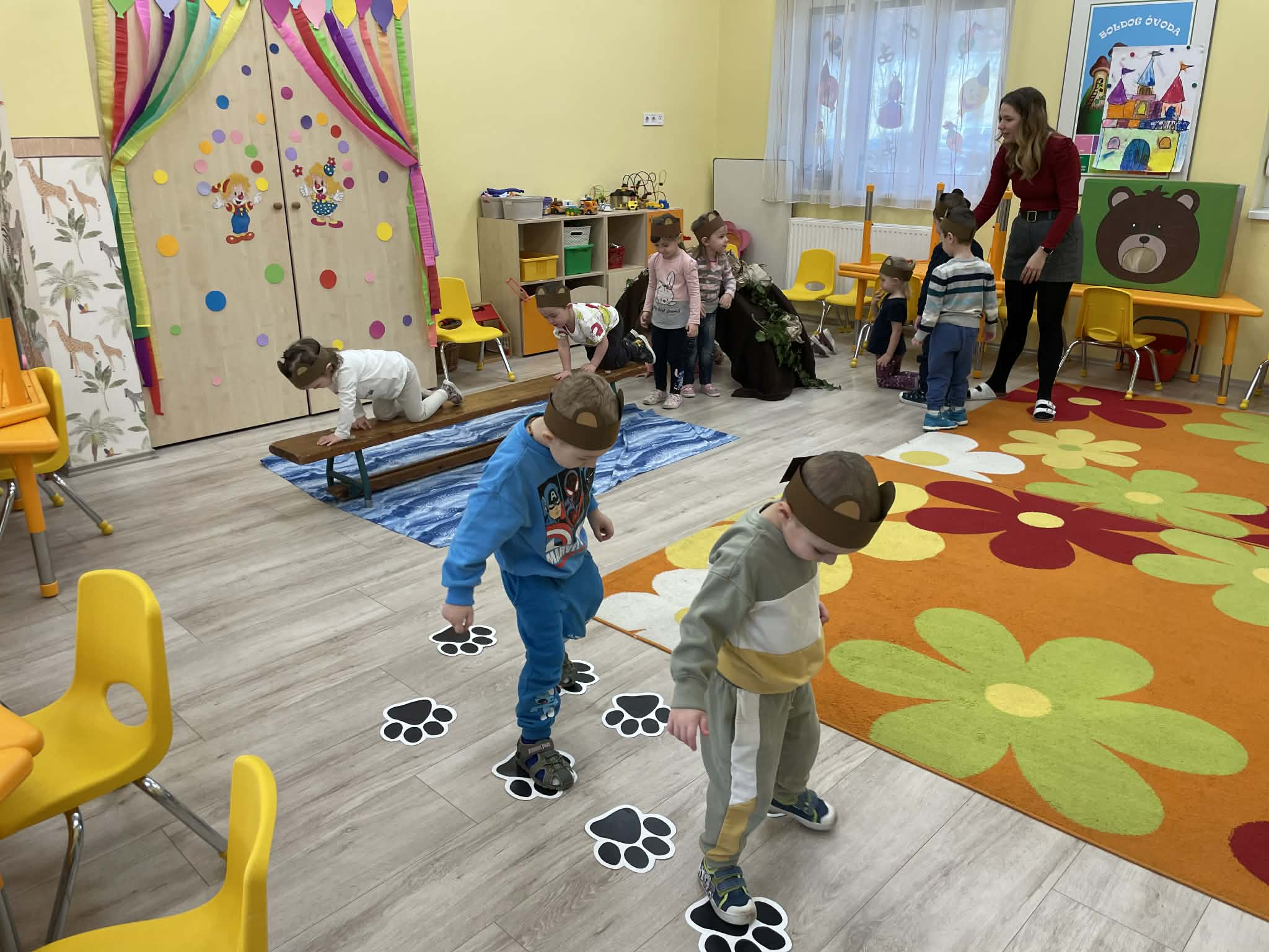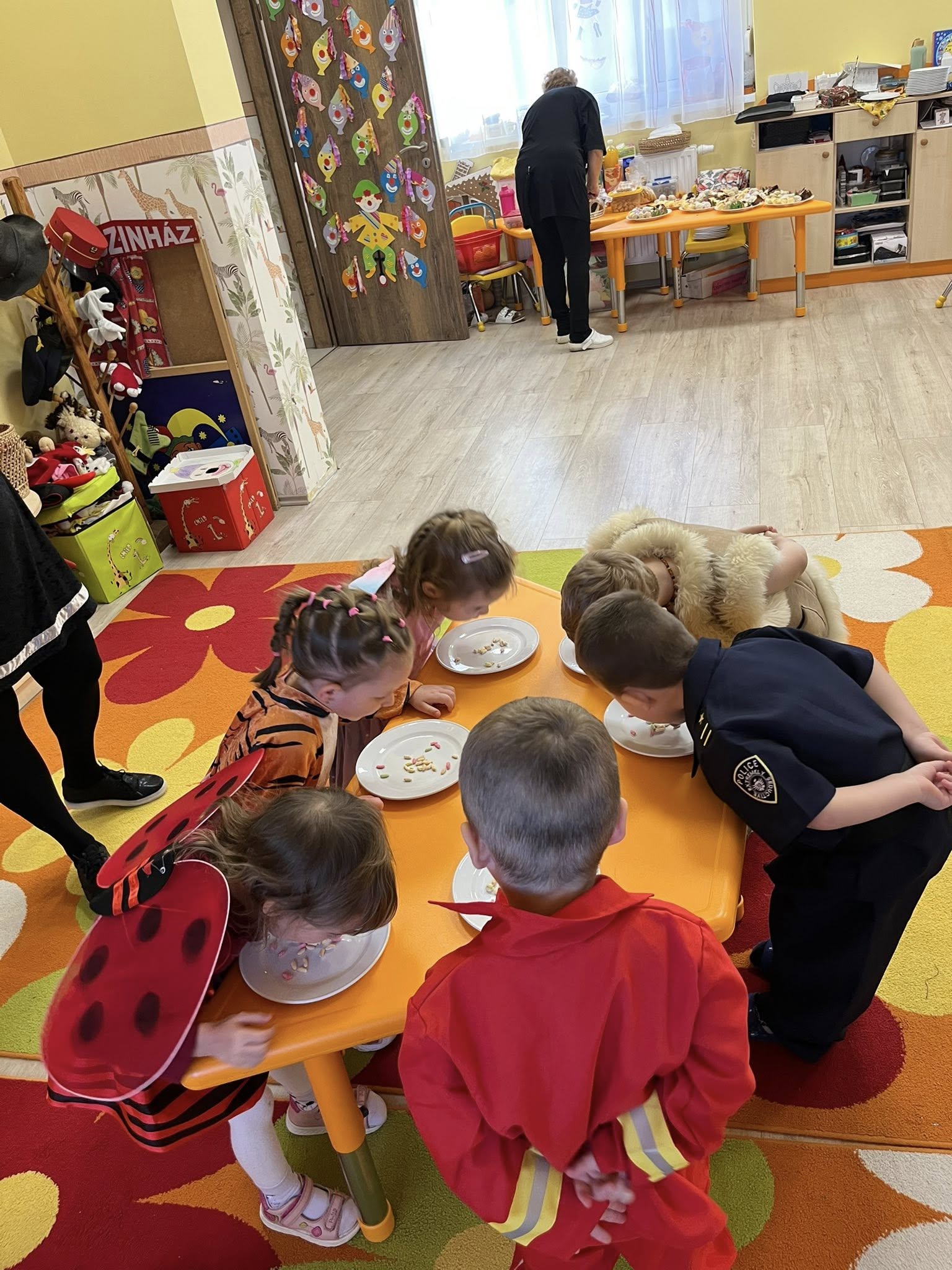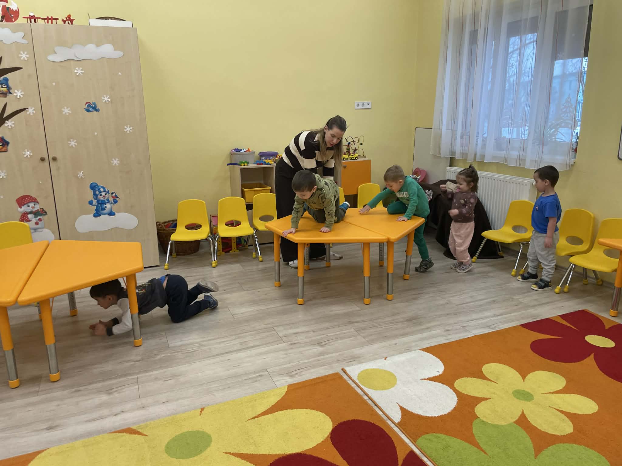 A farsangi időszak is alkalmas volt a vidámság mellett, a határaink feszegetésére. Számos olyan ügyességi feladattal készültünk, ahol a gyerekeknek nemcsak egymással, hanem saját türelmükkel és ügyességükkel is „meg kellett küzdeniük”. A bohócos játékok során a figyelemé volt a főszerep: a megadott színkártyák alapján kellett a labdákat a helyére tenni, ami komoly kognitív erőfeszítést igényelt. A farsangi dobókockás társas, a párosítók, a madaras mátrix és a téli ruhás dobble mind-mind a gyors döntéshozatalt és a kudarctűrést fejlesztették – hiszen nem lehet mindig elsőnek lenni, és ez is a megküzdés része!