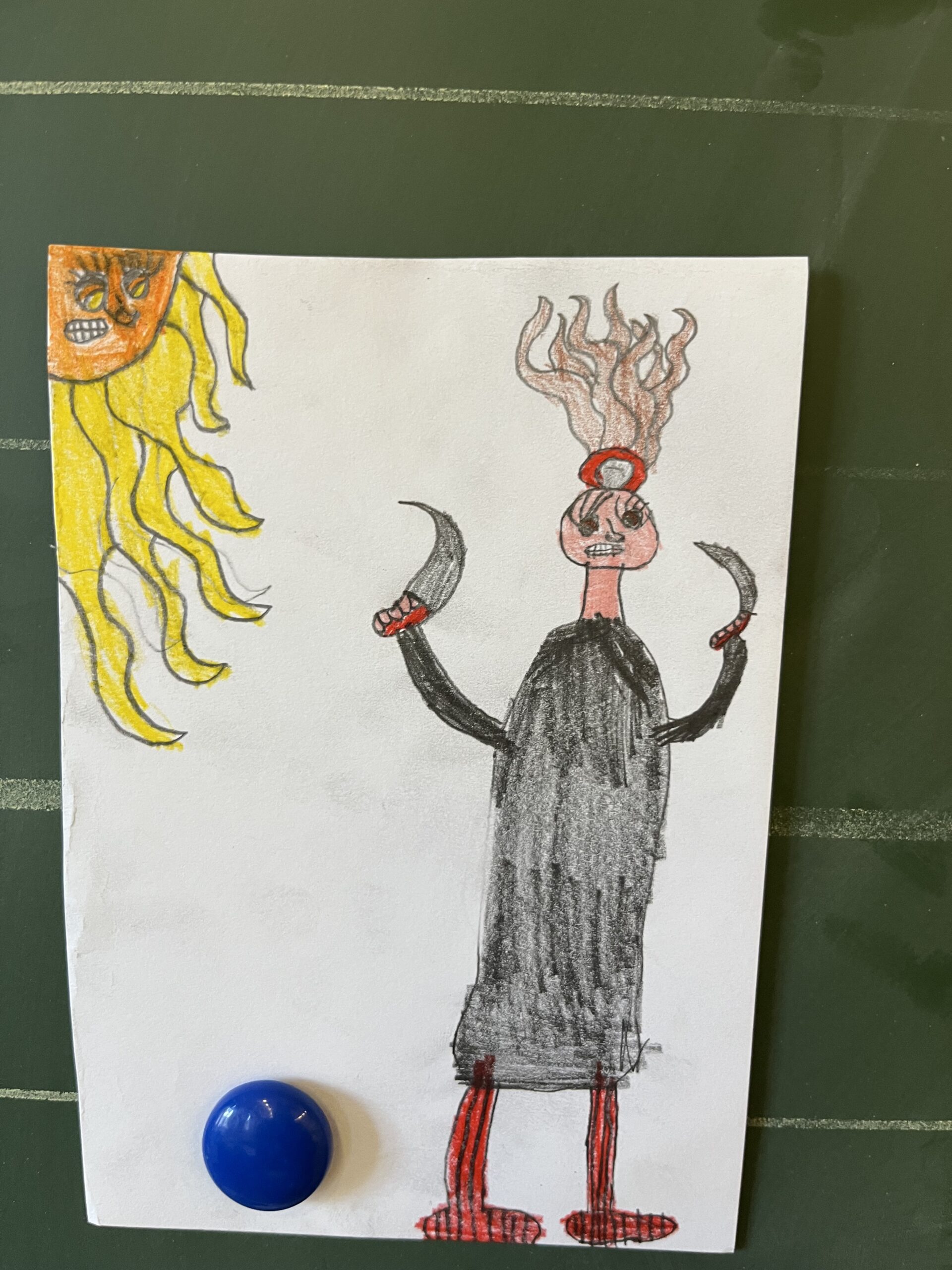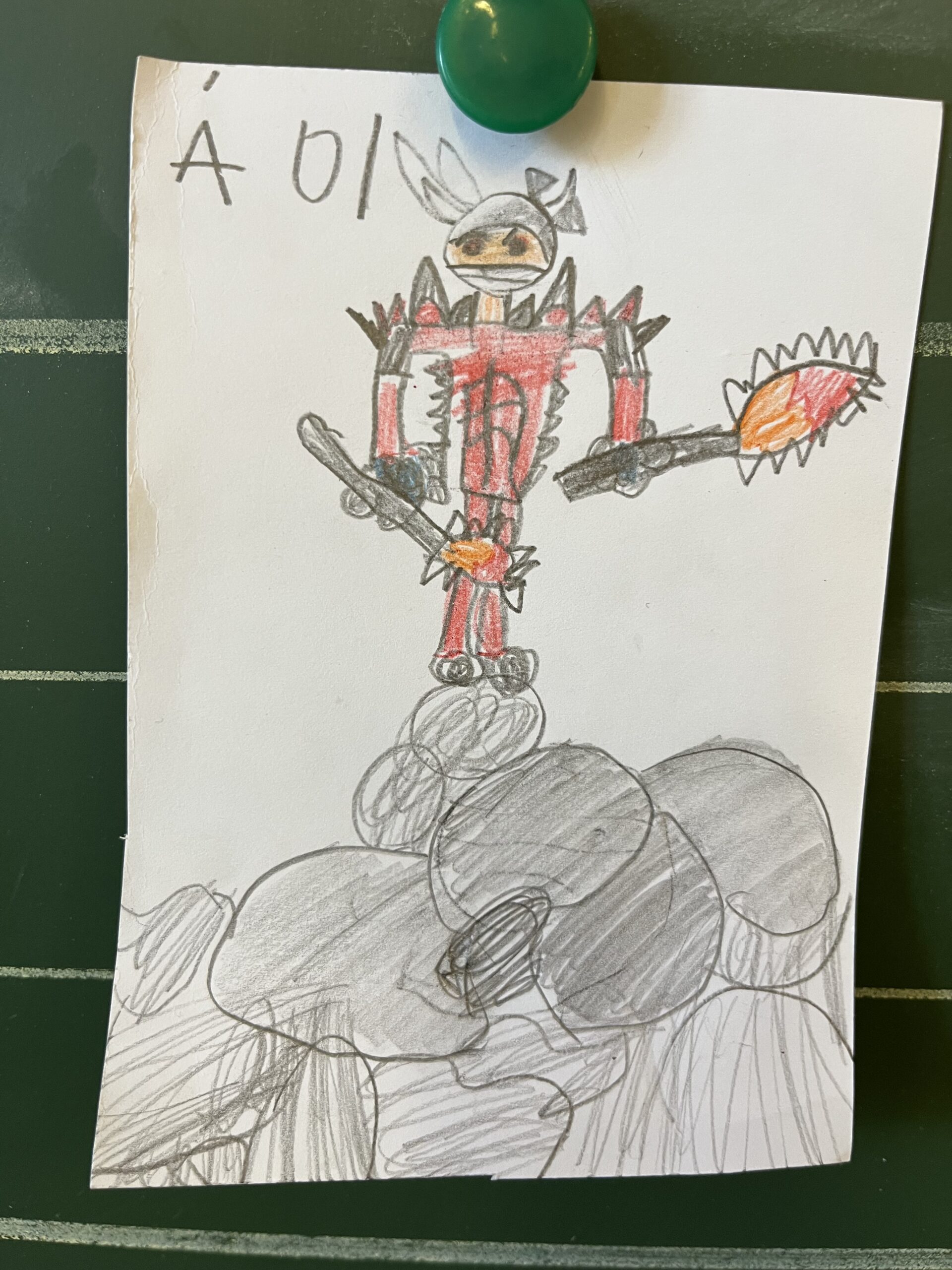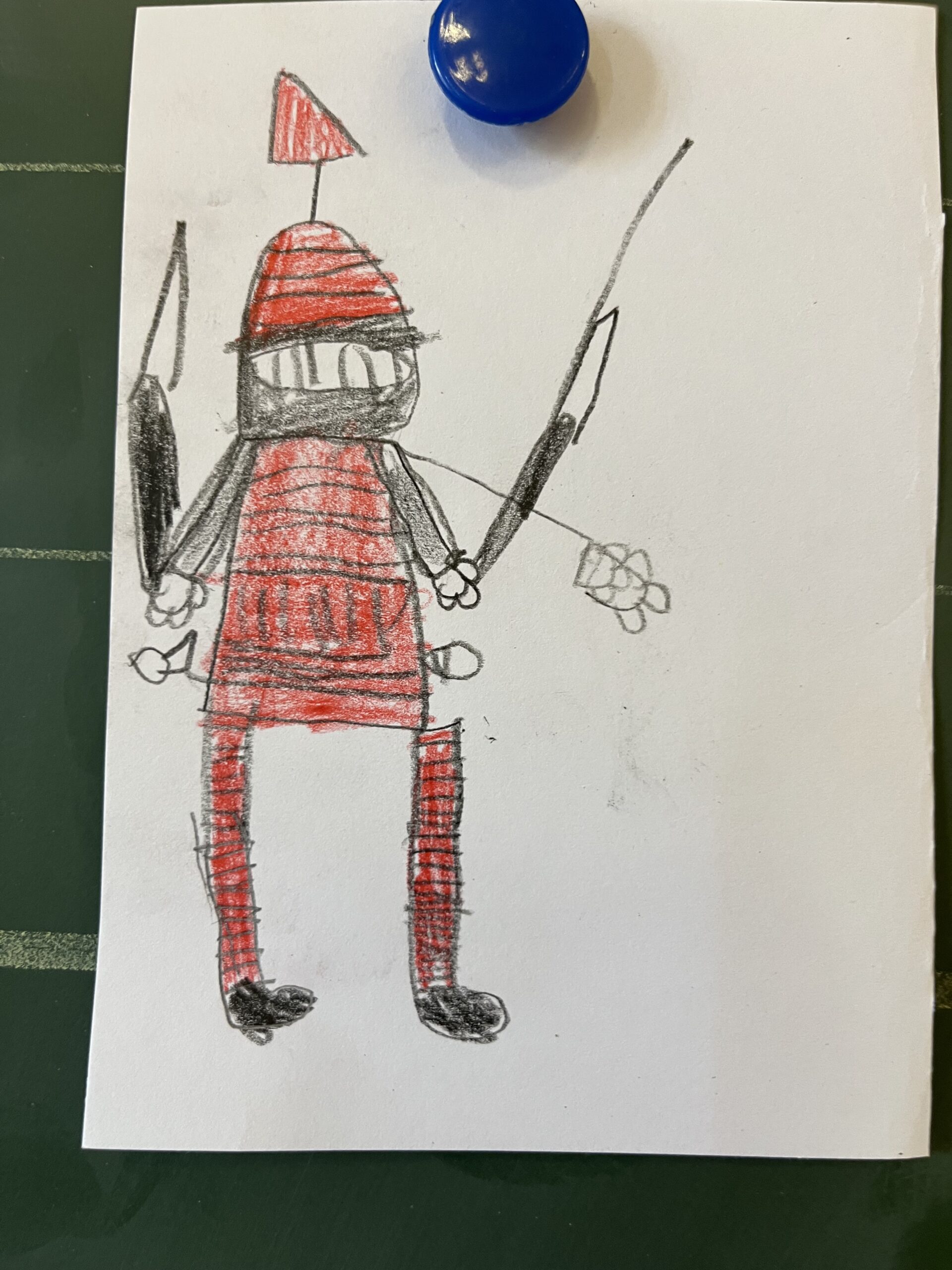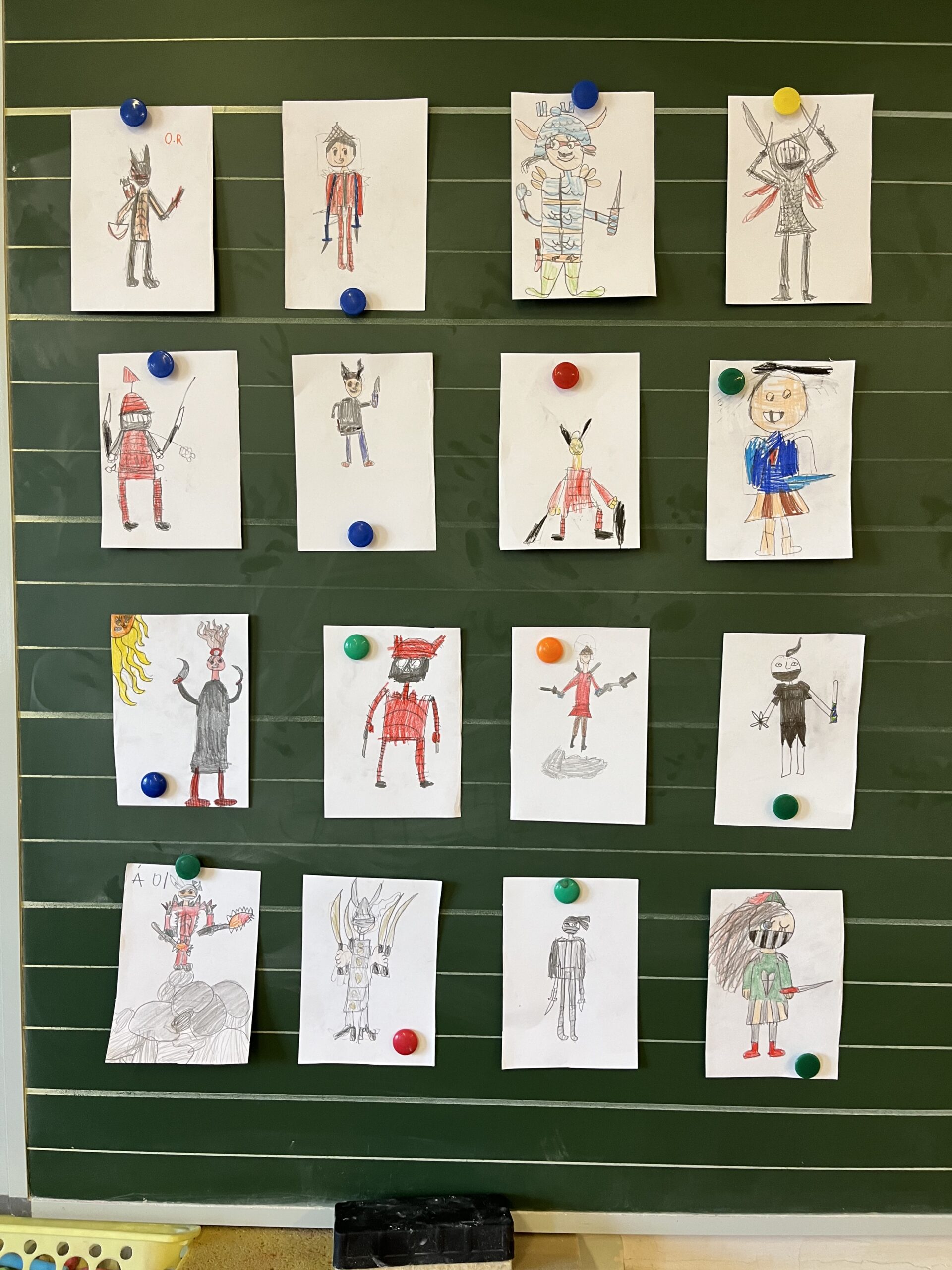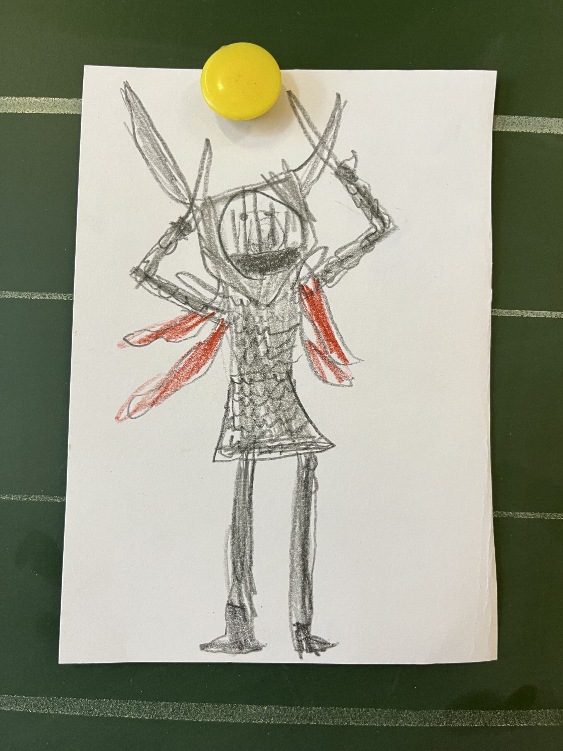 A szamuráj szerencséje című japán népmese meghallgatása után beszélgettünk a szamuráj, más mesehősök végül a saját erősségeinkről. Elképzeltük, majd lerajzoltuk milyen lehetne a mi páncélunk, ami segítségünkre van az akadályok leküzdésében a céljaink felé vezető úton.