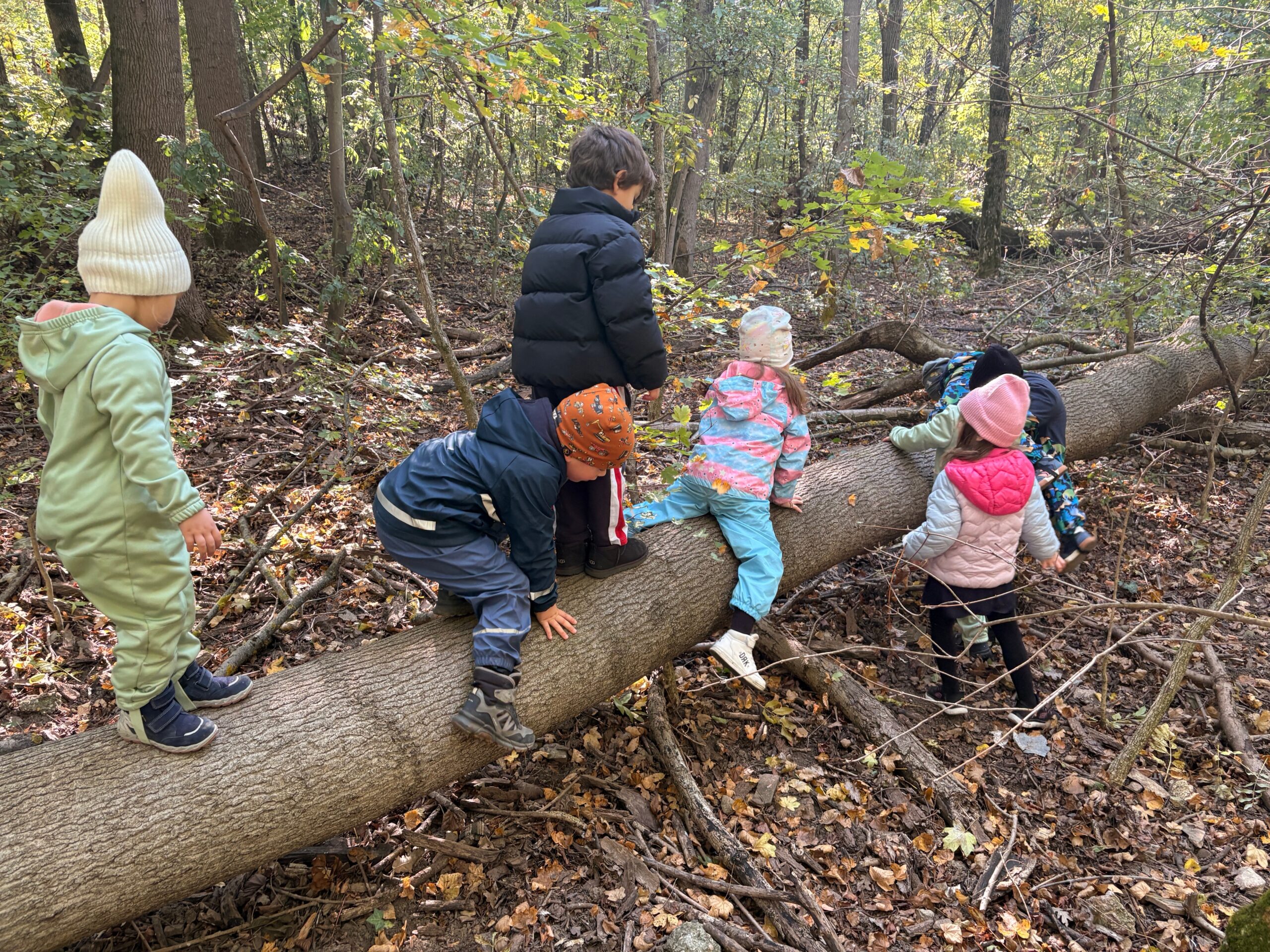 Őszi erdei sétánk során gyerekek közösen fedezték fel a természet szépségeit. A séta során lehetőségük volt nagy mozgásokat végezni, például farönkökön egyensúlyozni, mászni és ugrálni. A közös élmények során tapasztalhattuk az együttműködést, a gyermekek segítették és bátorították egymást, így a közösségi kapcsolatok is tovább erősödtek.