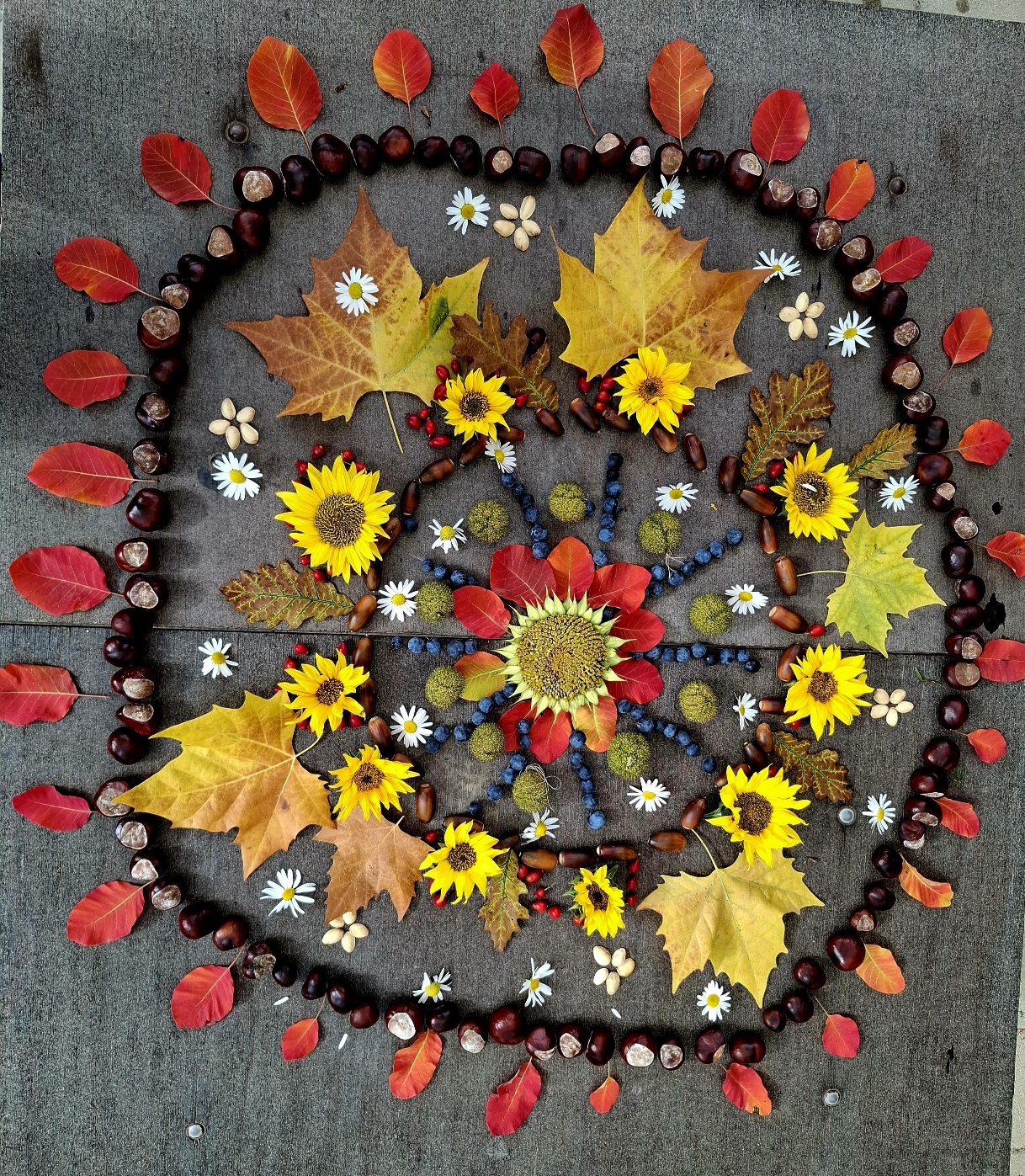 A gyűjtött termésekből, falevelekből közösen mandalát raktunk ki az ovi udvarán.