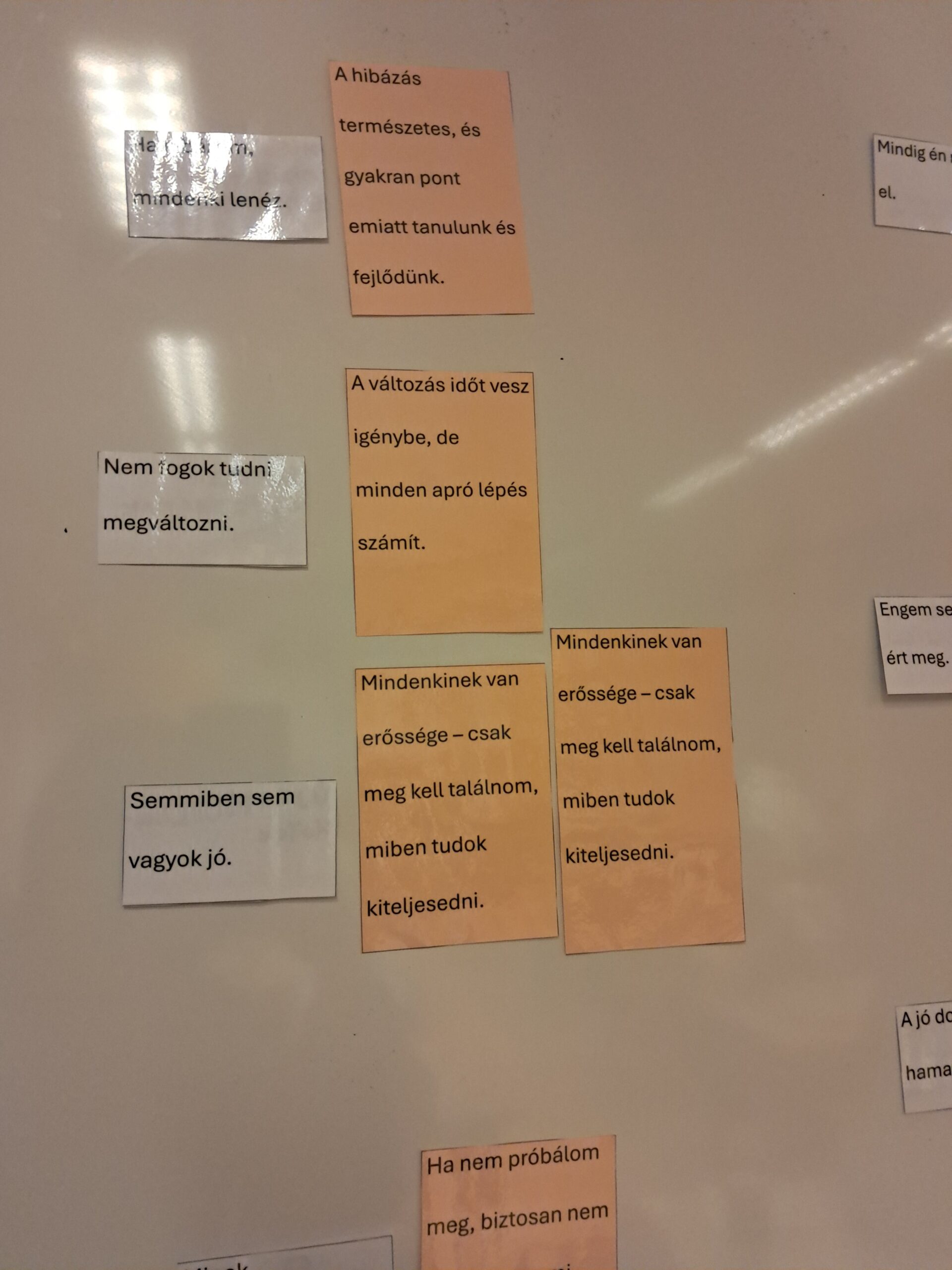 Az óra következő lépésében kis csoportokat alakítottunk, és kis kártyákon negatív mondatokat kaptak. A feladatuk az volt, hogy keretezzék át ezeket a negatív gondolatokat pozitívabb, optimista formába. Kis idő elteltével megosztotta minden csoport a mondataikat, elmondták saját „átkeretezéseiket”, felragasztottuk őket a táblára, majd a negatív mondatok „kész” optimista mondataikat is megkapták, megkeresték a párját és felragasztották ezeket is a táblára. Sok időt szántuk ezek megbeszélésére, és hangsúlyoztuk gondolkodásmódunk tudatosságára való törekvését.
