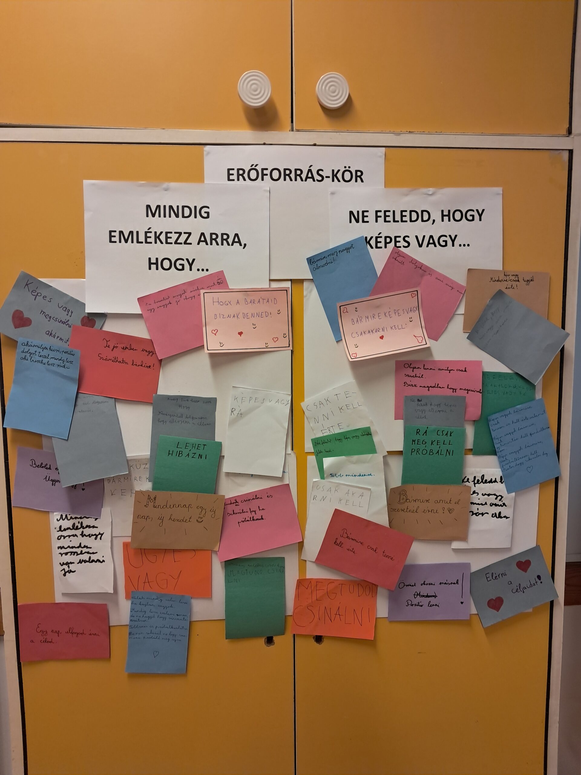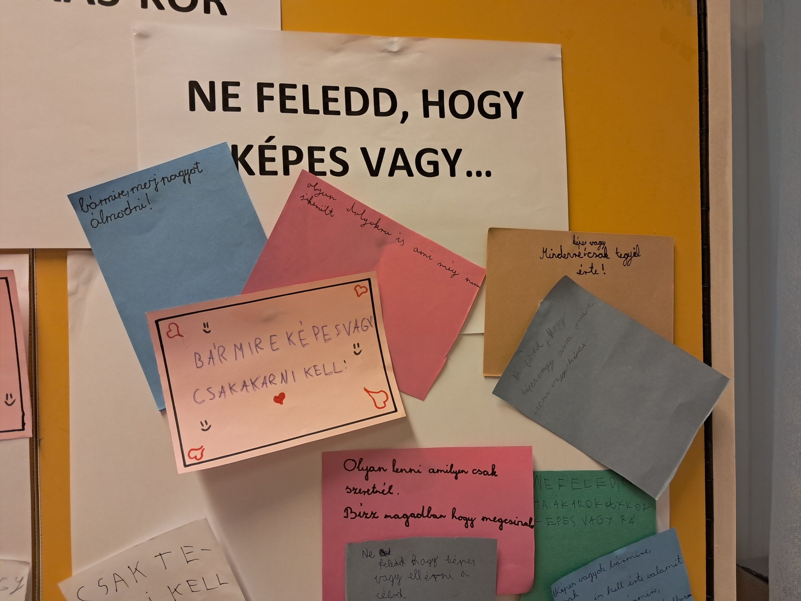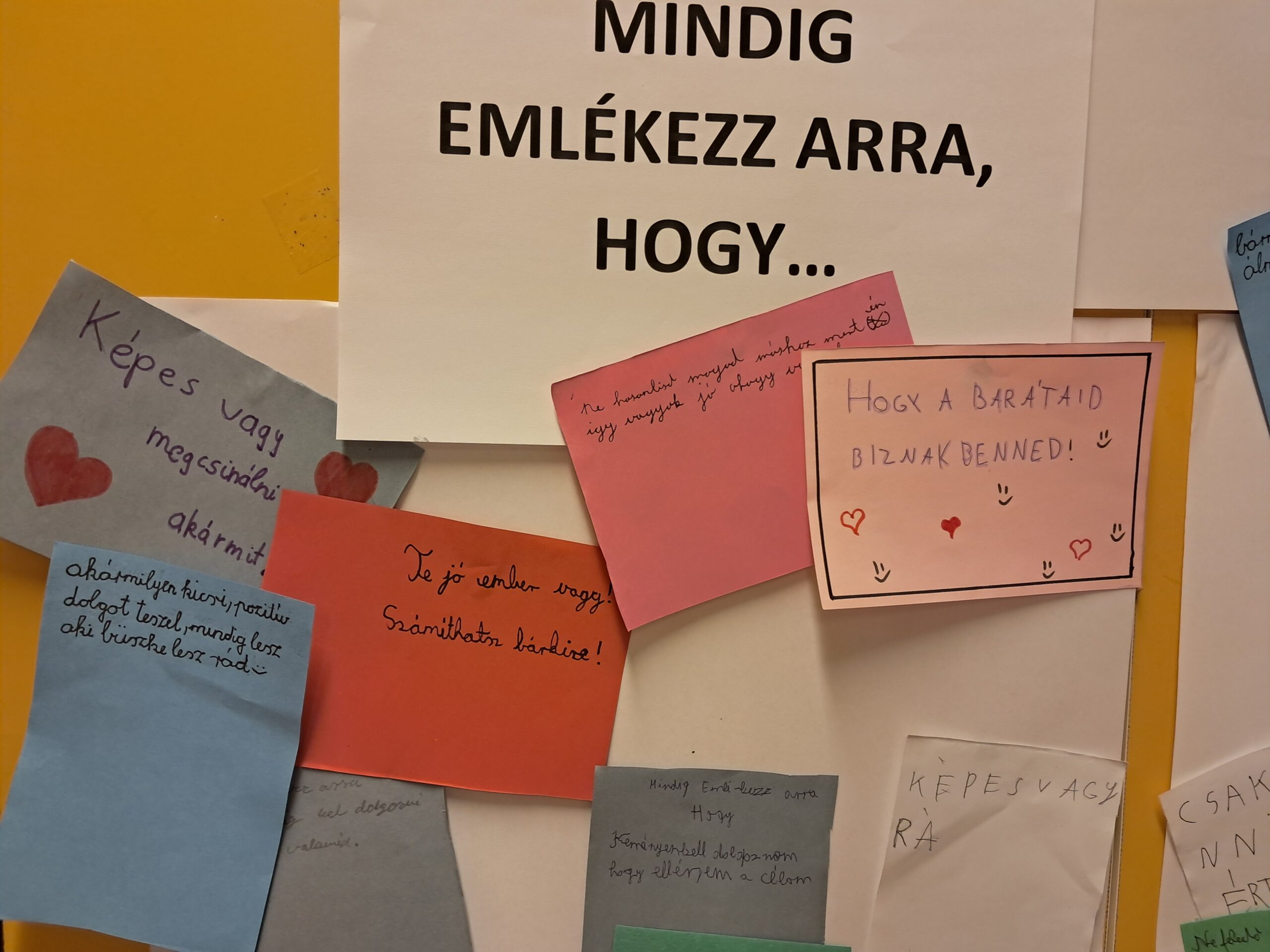 Végül következett az utolsó feladat, ahol a gyerekek megosztották, mit üzennének maguknak, ha egy nehezebb időszakban lennének. „Ne feledd, hogy képes vagy…” illetve a „Mindig emlékezz arra, hogy…” mondatokat fejezték be egy- egy biztató üzenettel.