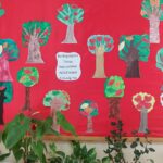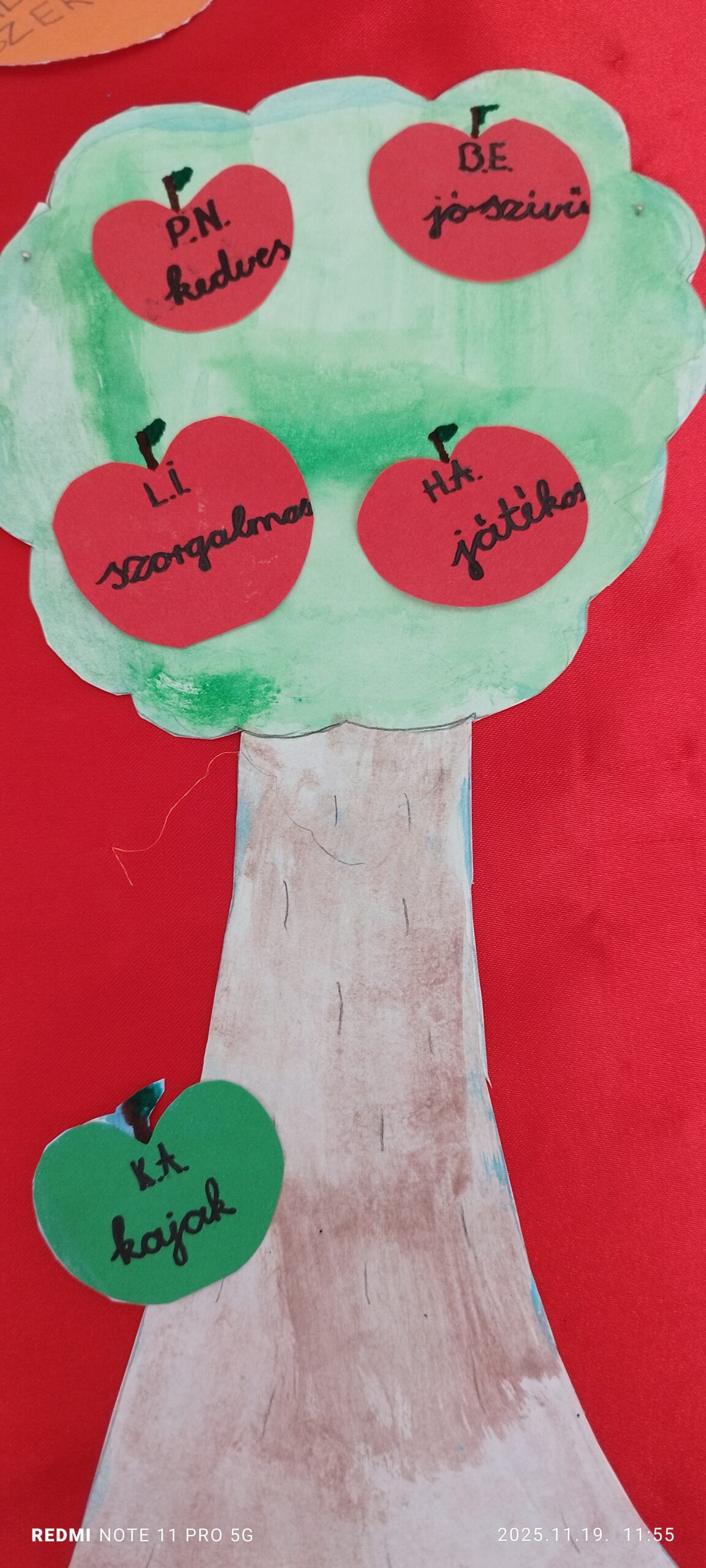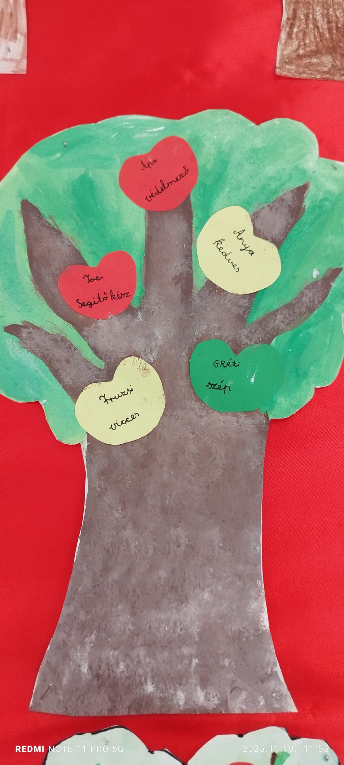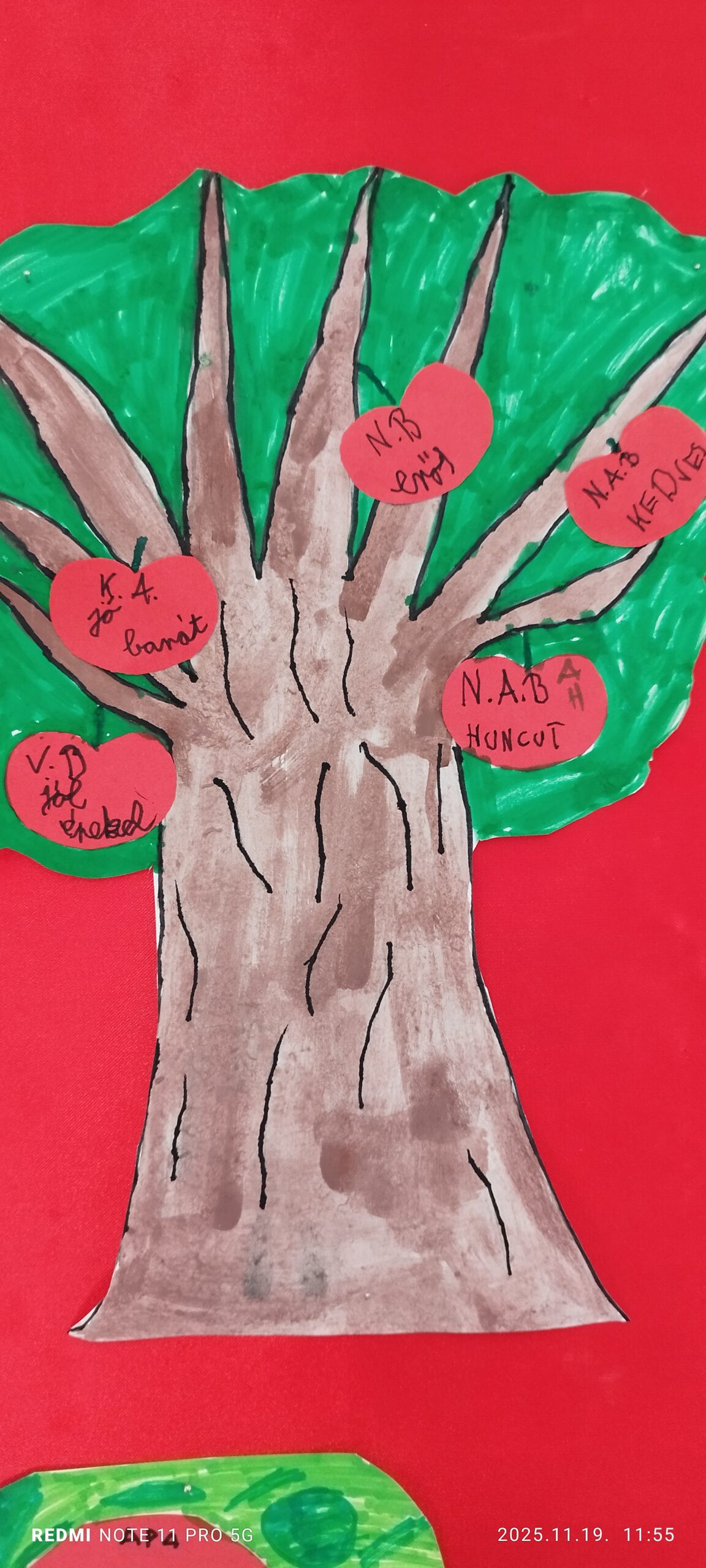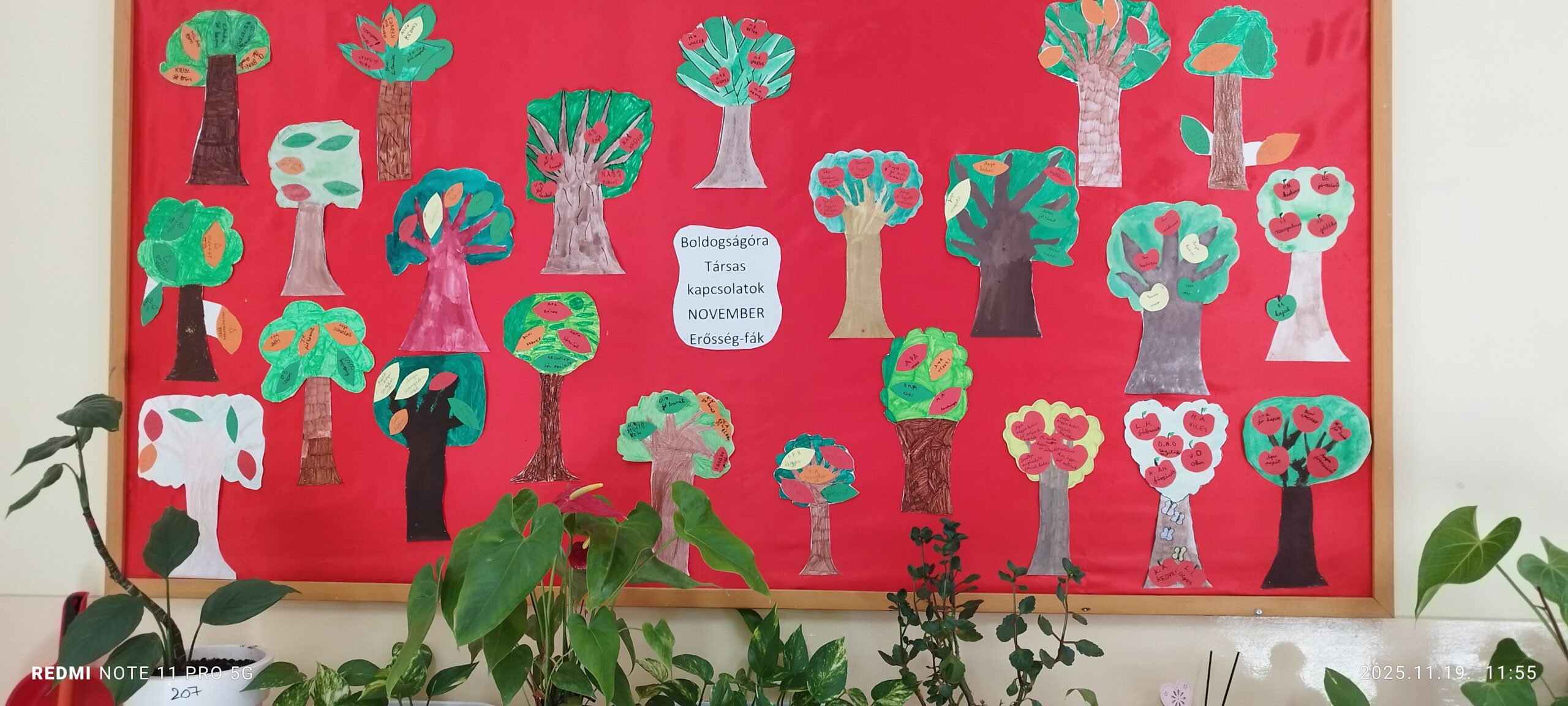 Ebben a hónapban Erősség-fákat készítettek a gyerekek. Gyümölcsöket , leveleket nyírtak ki és beleírták a családtagok erősségeit vagy a barátok, osztálytársak erősségeit. Aztán felragasztották az általuk készített fára. Beszélgetőkör formájában elmondták ,hogy miért esett a választás éppen azokra akikről írtak. Arról is szó volt, hogy milyen fontos, hogy meglássuk egymás erősségeit, milyen nagy erő , ha együtt tudunk működni, munkálkodni a családban vagy az osztályban. A fákat feltettük a boldogságórás programfalra, hogy mások is gyönyörködhessenek benne .
