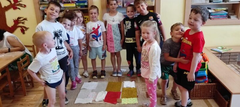 Ezután a „kíváncsi kezek” feladatban tapintójátékot játszottunk (vatta, buborékfólia, selyempapír, dekorgumi, szalvéta, függöny, szőrme). Először körbe adtuk a különböző anyagokat, megtapintották, elmondták milyen érzés megfogni, mi jut róla eszükbe. Ezután a felmutatott anyag párját kellett a takaróval letakart kupacból, tapintással kiválasztani.