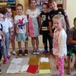 Végül „Boldogságszőnyeget” késztettünk a különböző anyagokból egy nagy csomagolópapírra. Nem ragasztottuk le, hanem több variációt is készítettek a gyerekek, amiket közösen megcsodáltunk.