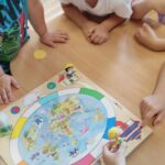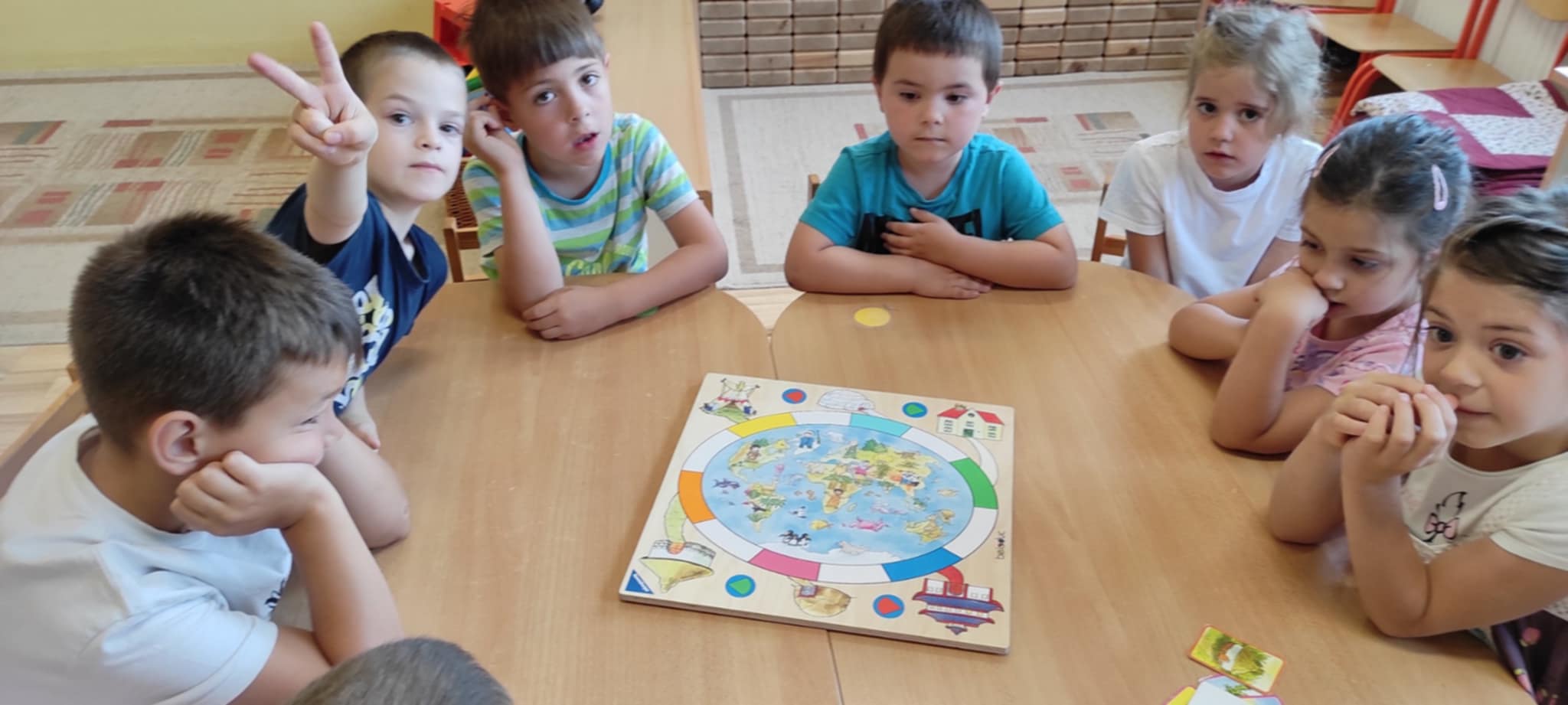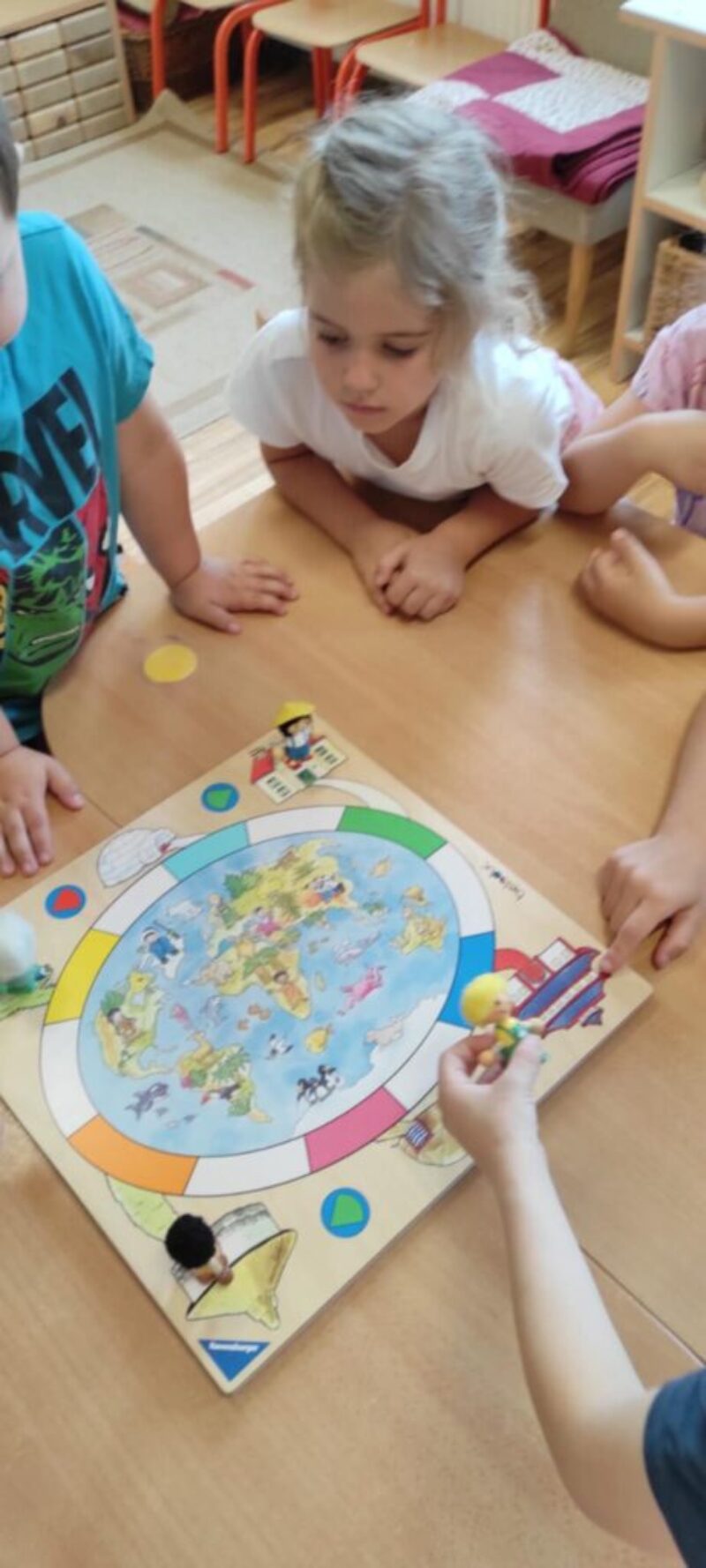 A „Világ gyermekei” társasjátékkal játszottunk bevezetésként. A játékmezőn található térképen megnéztük a földrészeket, a kis kártyák segítségével azonosítottuk azok jellemzőit.