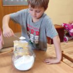 A hónap eleje óta gyűjtöttük a „jóság lisztet” (a lisztes zacskóból egy-egy kanál lisztet tehettek át az üvegbe azok a gyerekek, akik aznap nagyon figyelmesek, kedvesek, segítőkészek voltak), amiből a szülőkkel közös barkácsolós délutánra süteményt készítettünk.