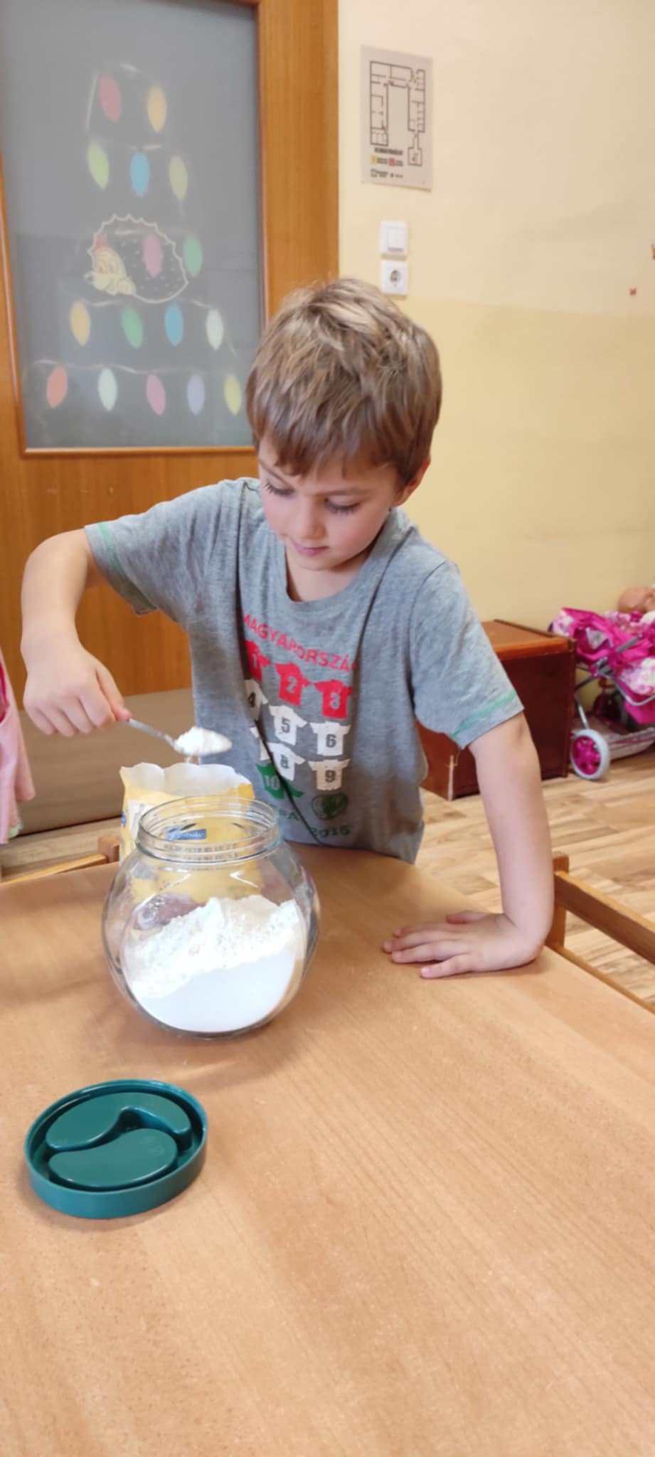 A hónap eleje óta gyűjtöttük a „jóság lisztet” (a lisztes zacskóból egy-egy kanál lisztet tehettek át az üvegbe azok a gyerekek, akik aznap nagyon figyelmesek, kedvesek, segítőkészek voltak), amiből a szülőkkel közös barkácsolós délutánra süteményt készítettünk.