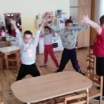 Nagymozgásos játékunkban zenére sétáltak a gyerekek a teremben, majd amikor a zene elhallgatott, az utasításnak megfelelő alakzatot kellett felvenniük: szánkó – széktartás, hógolyó-összegömbölyödés, hópehely – terpesz, karok magastartásban.