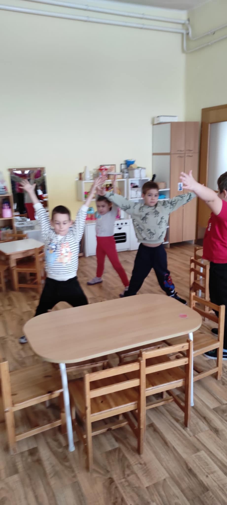 Nagymozgásos játékunkban zenére sétáltak a gyerekek a teremben, majd amikor a zene elhallgatott, az utasításnak megfelelő alakzatot kellett felvenniük: szánkó – széktartás, hógolyó-összegömbölyödés, hópehely – terpesz, karok magastartásban.