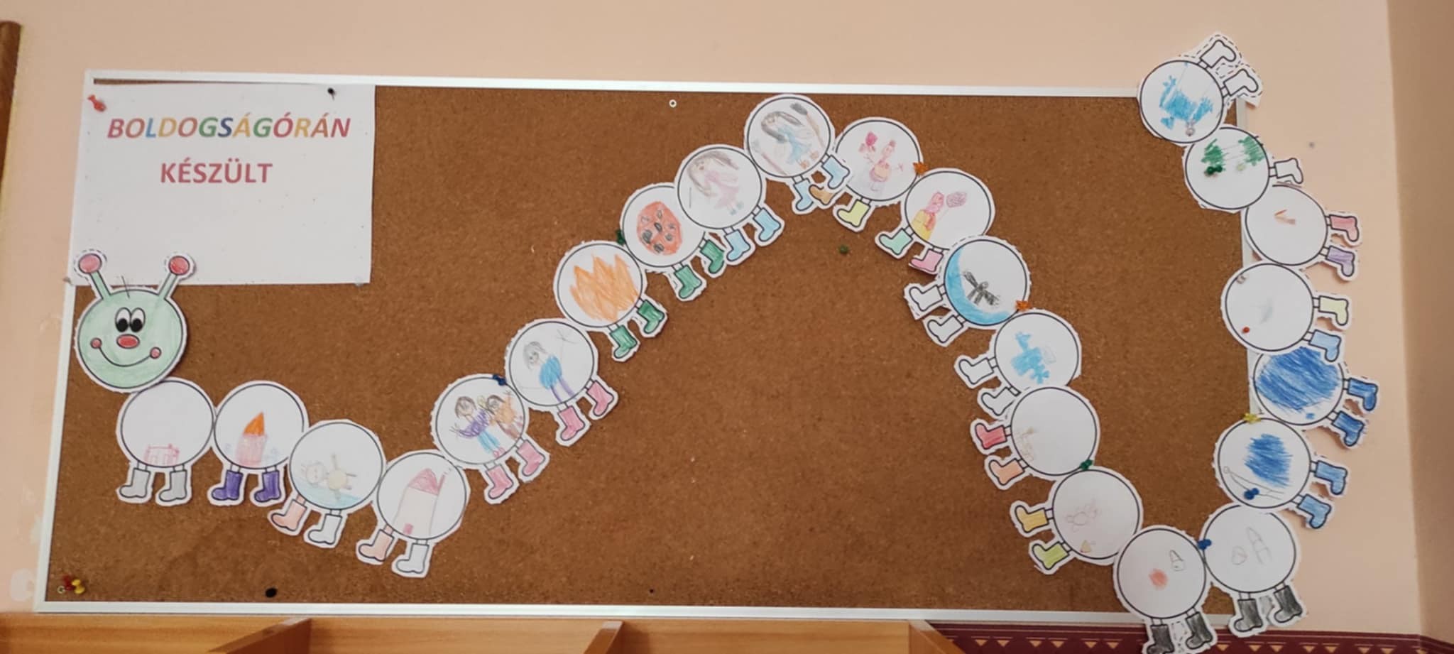 Közben Bagdi Bella: Van nekem egy álmom c. dalát hallgattuk, az elkészült százlábút a faliújságon helyeztük el.